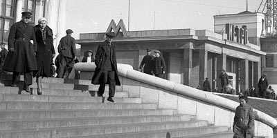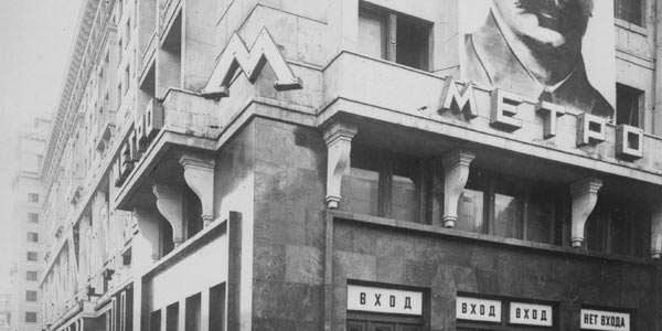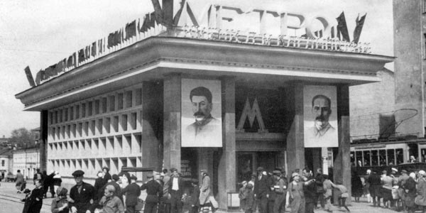 Entrance to Komsomolskaya station, circa 1937. The Metro sign was replaced by a plate which read “Kaganovich Moscow Metropolitan.” The emblem was also replaced by a version with thick serifs |