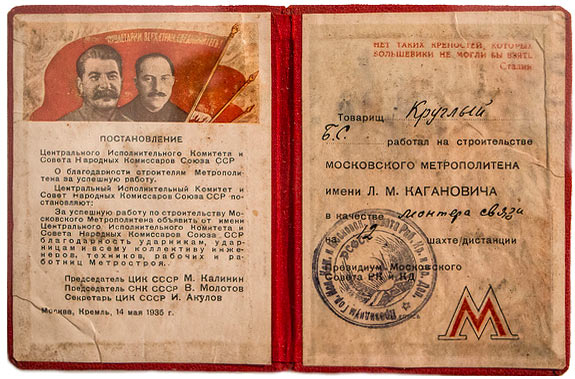 This is a really good example of how different versions of the same letter are born. If we see the outside contour as an inking, the proportions of the letter change. This becomes especially important when the letter is printed in two colors, red and black, like in the example below. Here is a letter of appreciation given to comrade Krugly for his work on construction of the Metro: