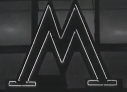 The first entrance letters were illuminated by neon at night. Neon tubing highlighted internal contours of the letter which was depicted in printed versions of the logo. In the 1930s the letter was often drawn with these outlines, yet their number and designs were always different. This negligence played a cruel joke with the logo. Let’s have a look at the letter from the poster for the Yest Metro! movie which came out in 1935. This letter is made up of several letters, just like a matryoshka doll.
