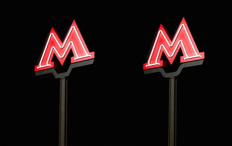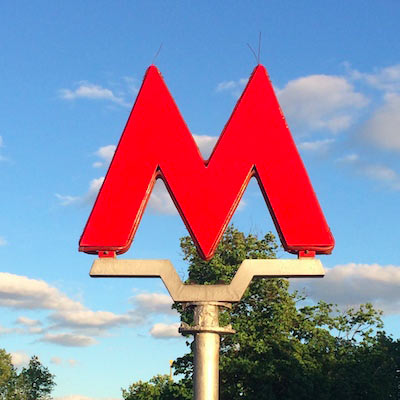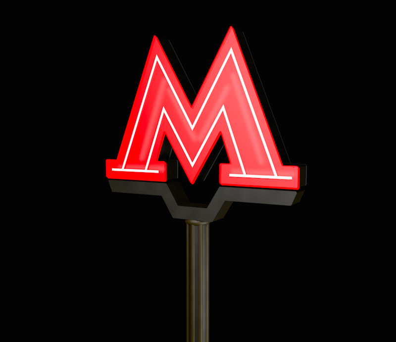 The next milestone in the history of the logo was in the 1960s when the letter started to lose its serifs, both in street signs and in print. In the same years the attitude towards the Metro changed as well: above-ground entrances stopped being a mandatory part of a proper station and entrances to some stations were built into underground pedestrian tunnels. In these cases, stelas with illuminated letters which had no serifs were installed near entrances to such tunnels. This is the image that survived to the present day, apart from an updated illumination technology. It is for this reason that the existing street logo has no serifs.