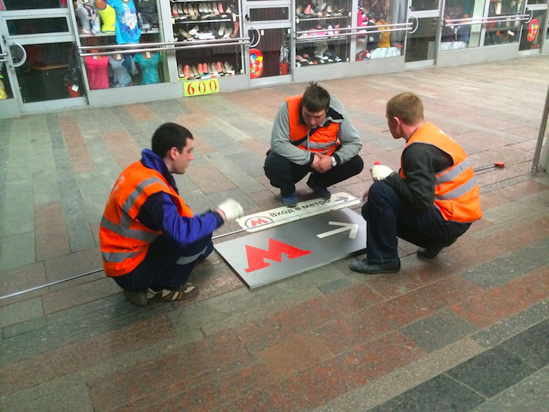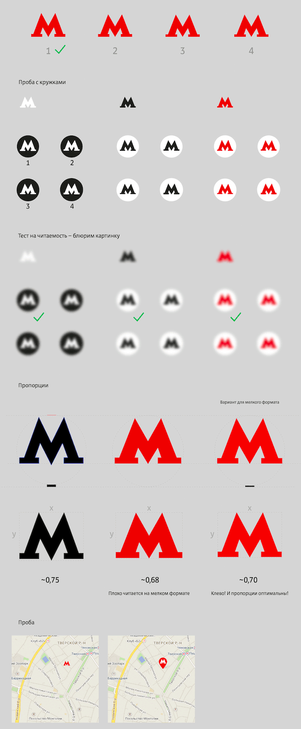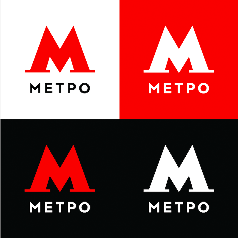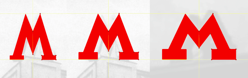 First I was simply consulting Yegor and Ludwig, I told them about the history of the logo, how it evolved and why. But ultimately it just so happened that I was the one to work on the design. By this time, Yegor has already created his version of the letter M whose thin pronounced serifs were just begging to be enlarged. Also, if an illuminated version of the logo were to be produced, it would be difficult to illuminate such thin elements. Though the “Metro” text was happily approved by everybody. One question remained however: wouldn’t foreigners read it as “Metpo” instead? But we decided they will probably get used to it quite soon. In fact, it will even help them to remember that Russian P sounds like R. But combining the logo with the text is definitely a good idea. We just need to make sure the distance between the image and the text is maintained when the logo is reproduced.