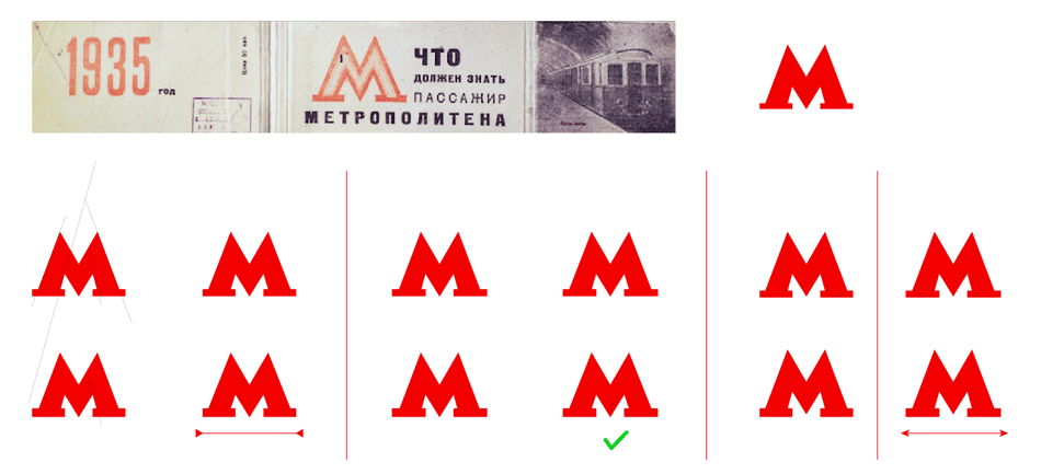 As much as I tried, I couldn’t find any logic behind this variety, it seemed that each logo was created independently of others. In order to understand which design is the correct one and what proportions it should have, I decided to refer to history. I visited newspaper archives, searched for anything related to the opening of the Metro, looked at pictures of the first stations unveiled in 1935 and visited the Moscow Metro Museum. I then used all the accumulated information to write a LiveJournal post about what the Metro logo should really look like today. I picked out the most used shapes, compared them and made some conclusions: http://ckonovalov.livejournal.com/99653.html.