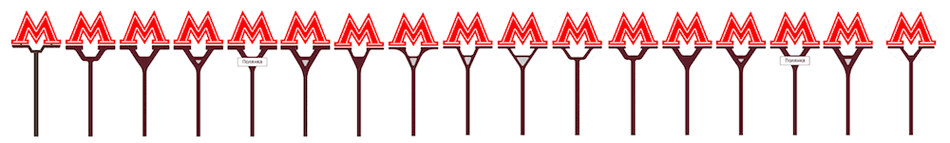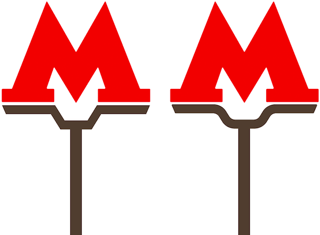 Of course, it’s only a guess. But the only way to explain the prominent serifs of the letter is that it was created by architects, not artists. That’s how they emphasized the constructive distinctiveness of the letter. In any case, the serifs are an important part of the logo which needs to be maintained (in contrast to the semicircle we discussed before which is obviously a transient element and can be easily discarded). Some of station entrance models from the 1930s feature a letter M that is somewhat similar to the one we have today. Maybe, the architects simply chose to improve this symbol. It’s hard to say for sure.