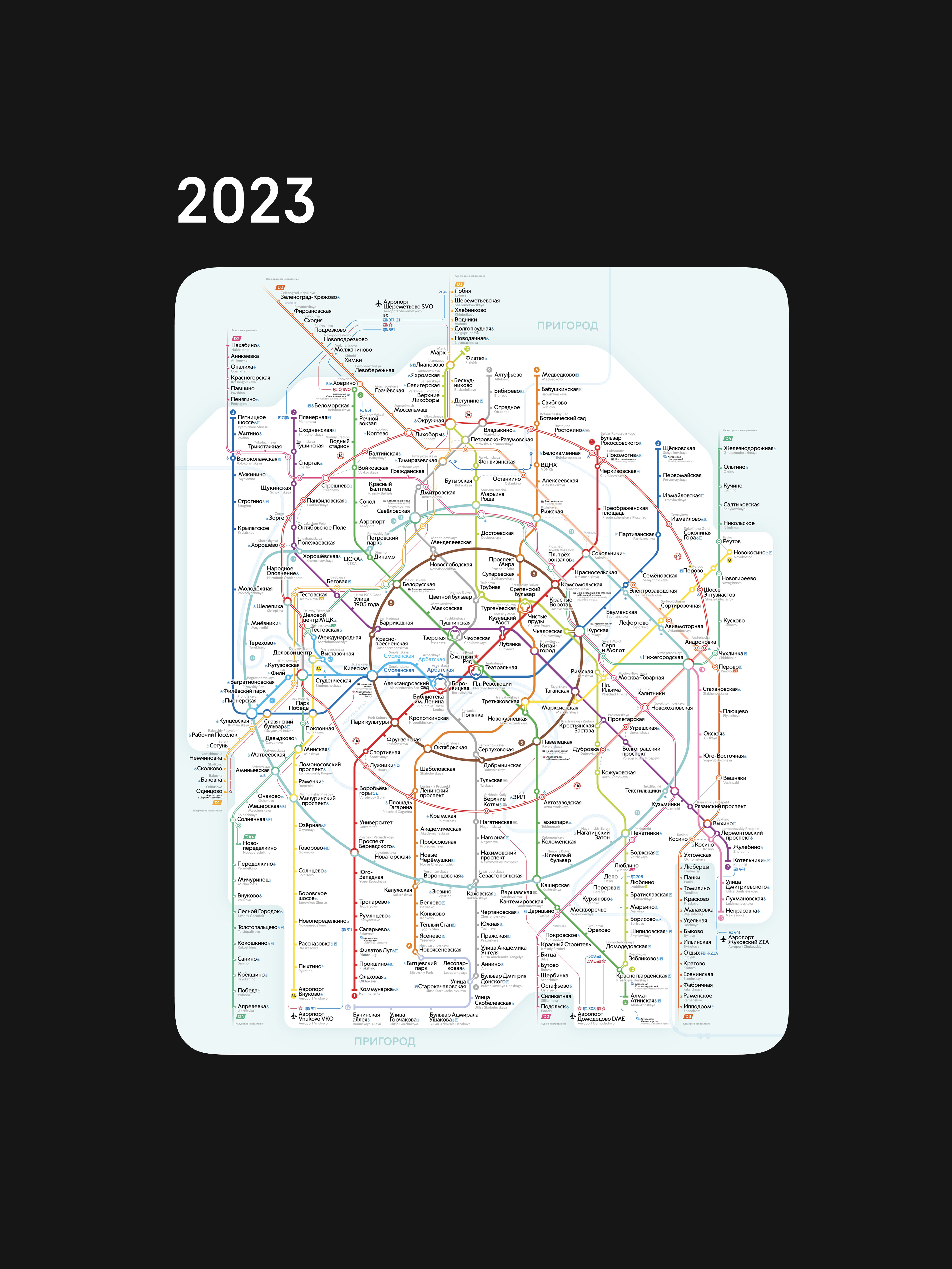 In May 2025 the Moscow Metro turned 90 years old. For this occasion, the studio created a concept map that reveals the prospects for the development of the capital’s metro. The concept found room for all plans that were relevant at the time of drawing.
