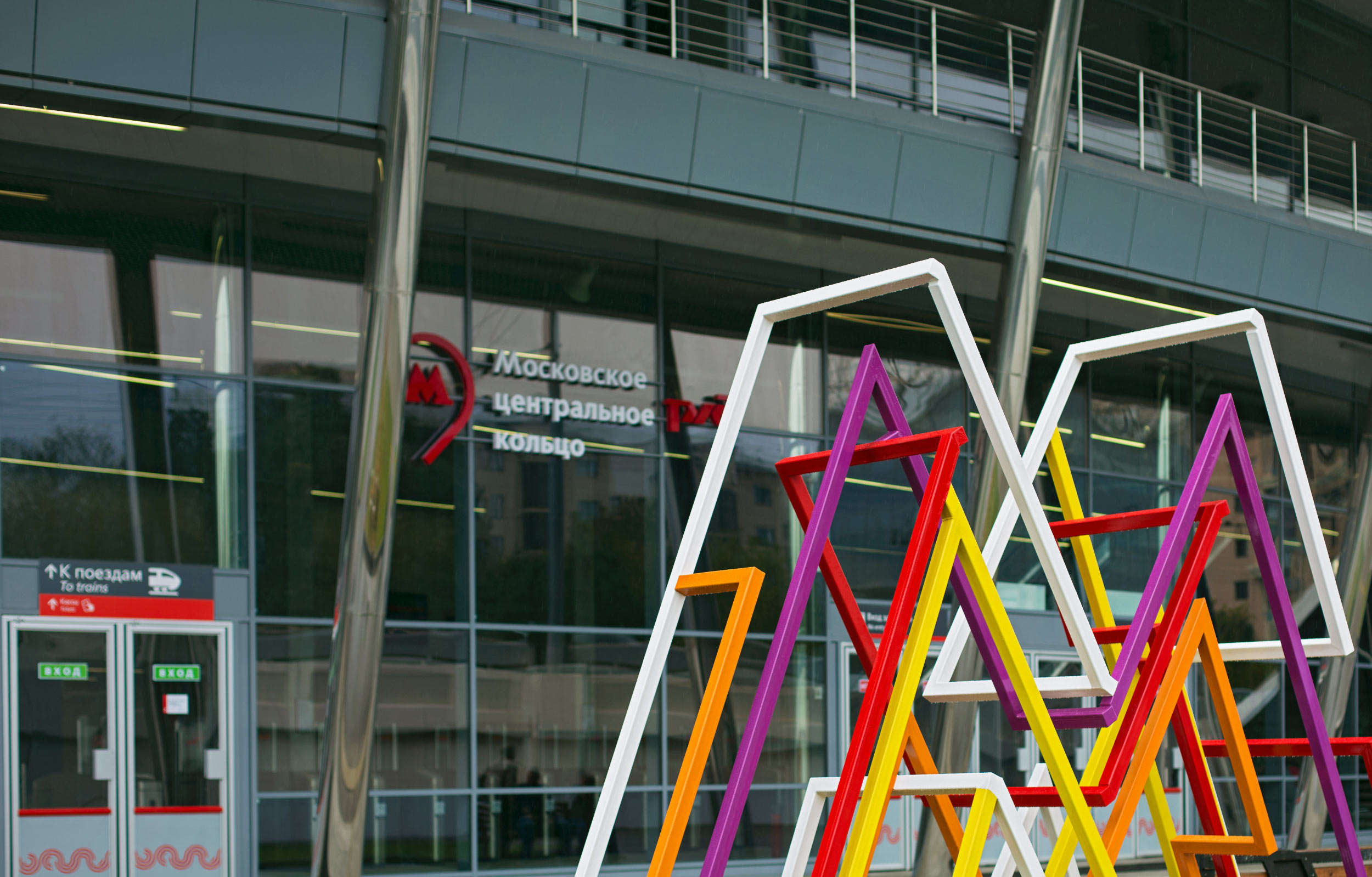 An object in the shape of the letter M made of metal pipes in the colors of Moscow Metro lines represents the Metro. The longest white pipe is the Moscow Central Circle