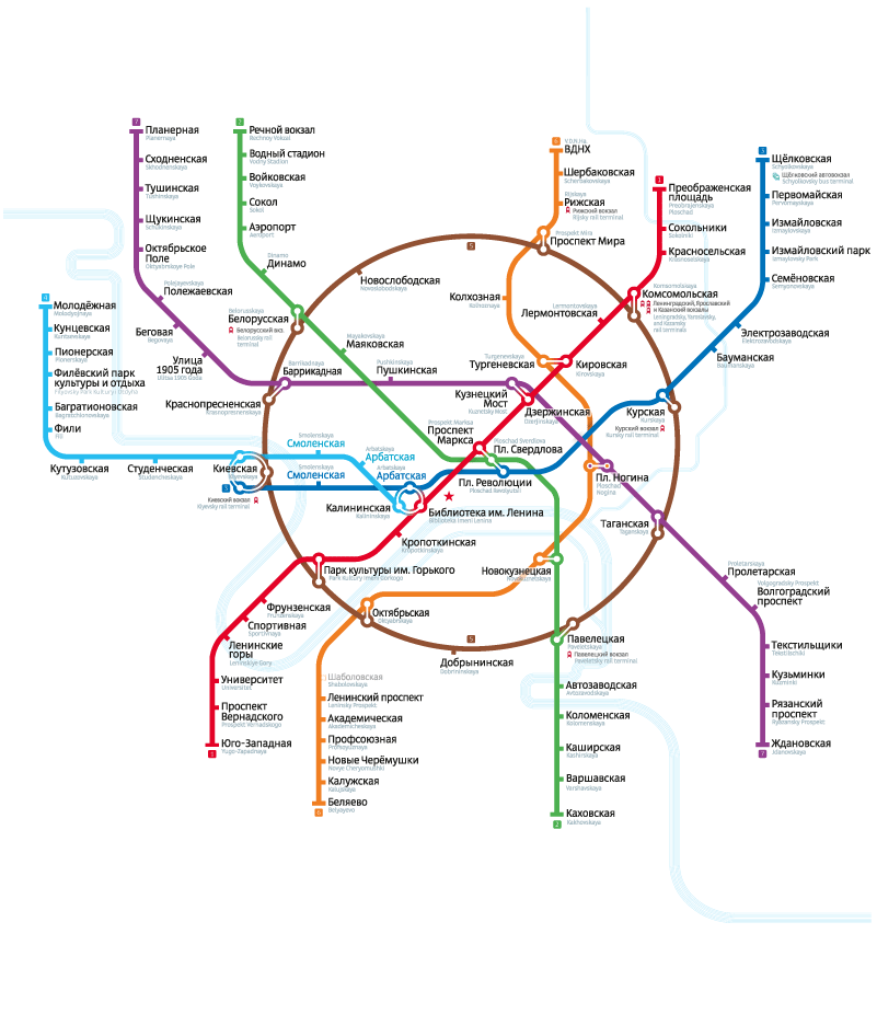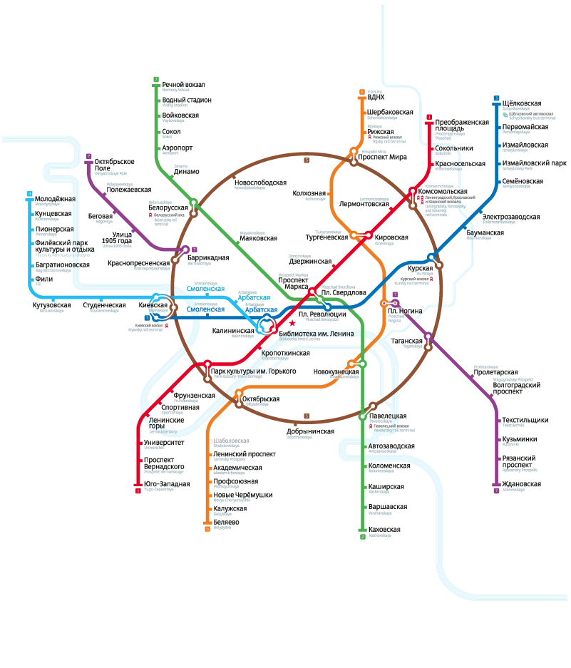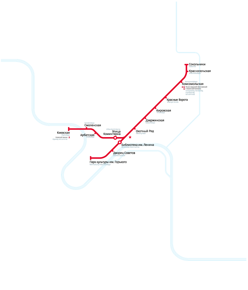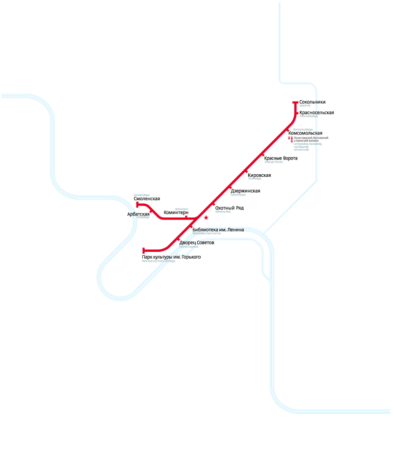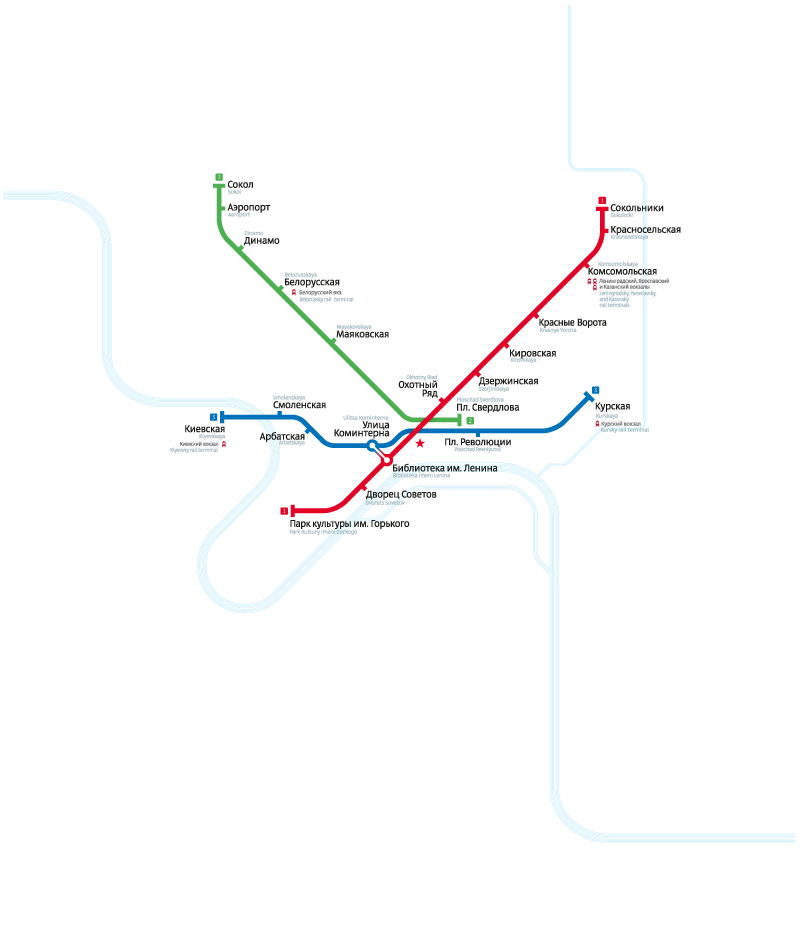 Map: the Kremlin, Aeroexpress train to airports, and the star