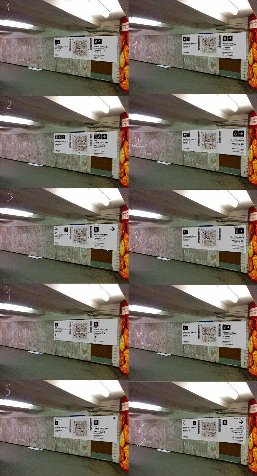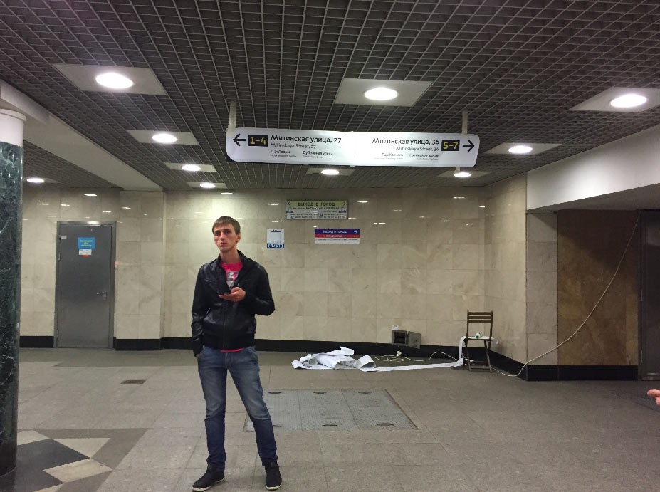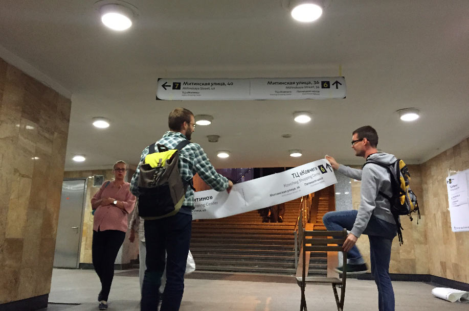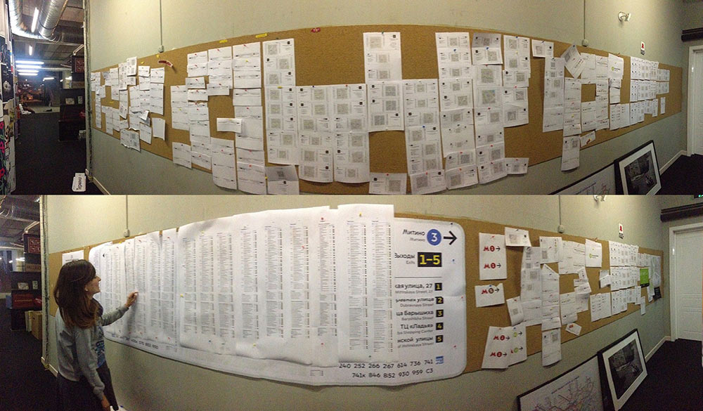 To make sure we’re not wasting our time arguing, deciding to hold a test in the Metro. Going to Mitino station to try out two navigation designs: one with the priority given to streets and the other where shopping centers dominate.
