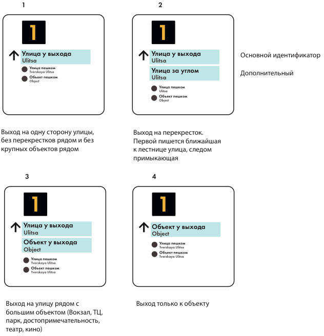 Each entrance serves a separate sector of the adjacent territory and each sector is important. We need to name each exit according to the street to which it leads directly. In those cases where all exits lead to the same street, we need to provide additional information that will allow to tell them apart.