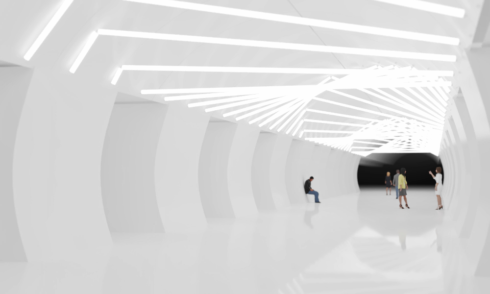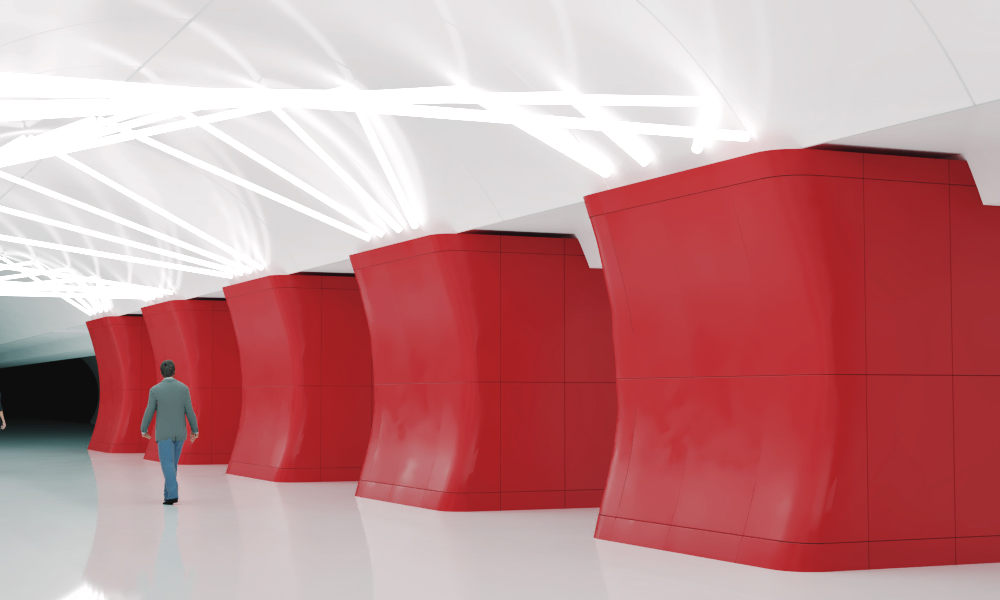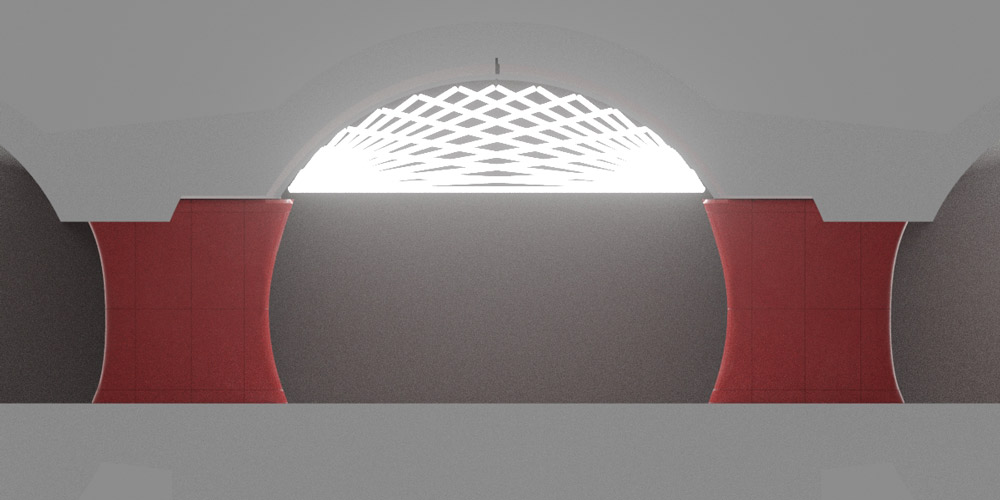 Trying to emphasize tectonics of the vault and make it more diverse by rhyming the light fixtures with the pylons.