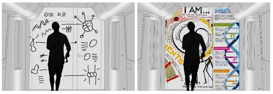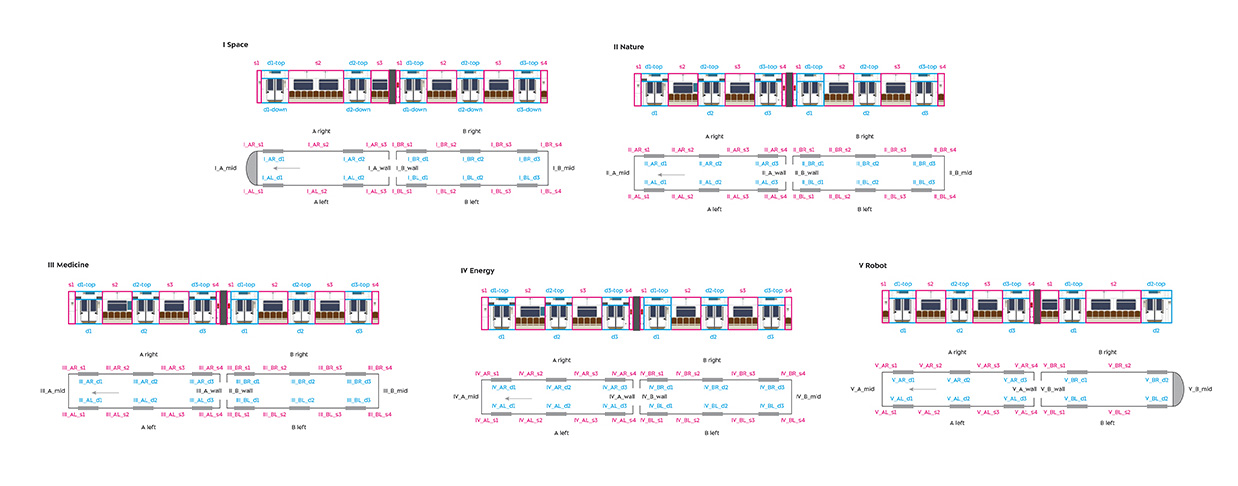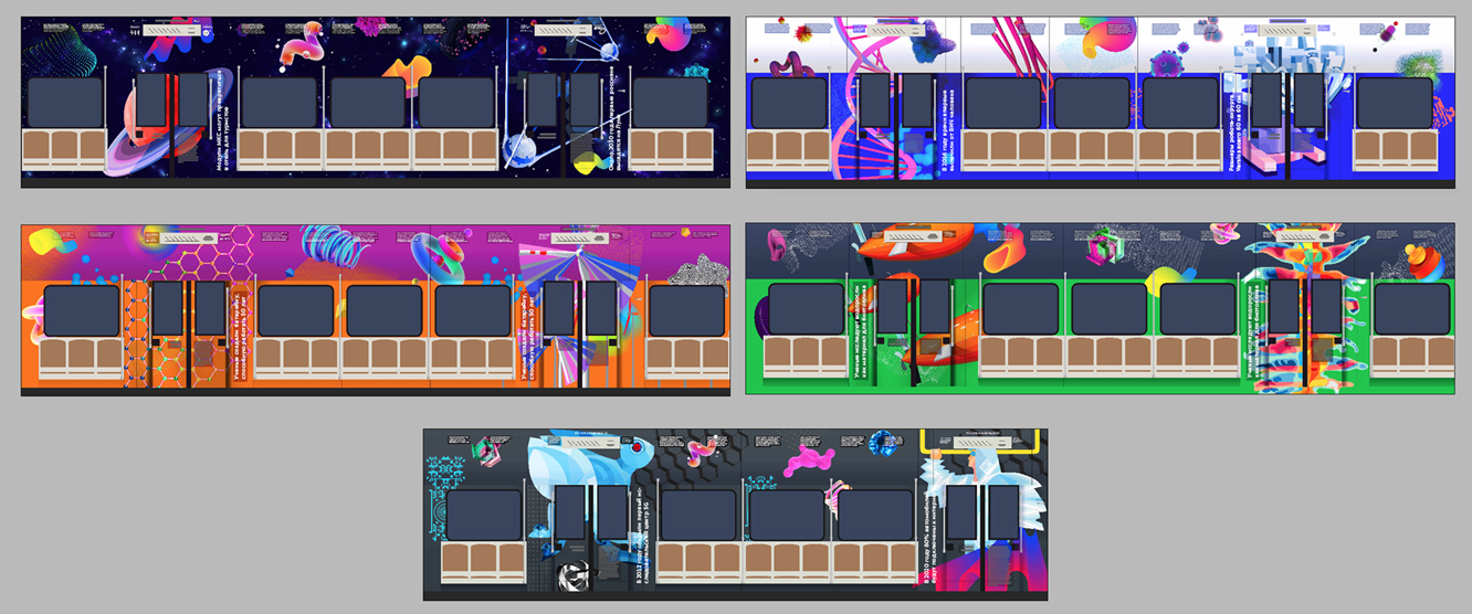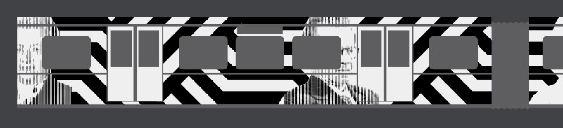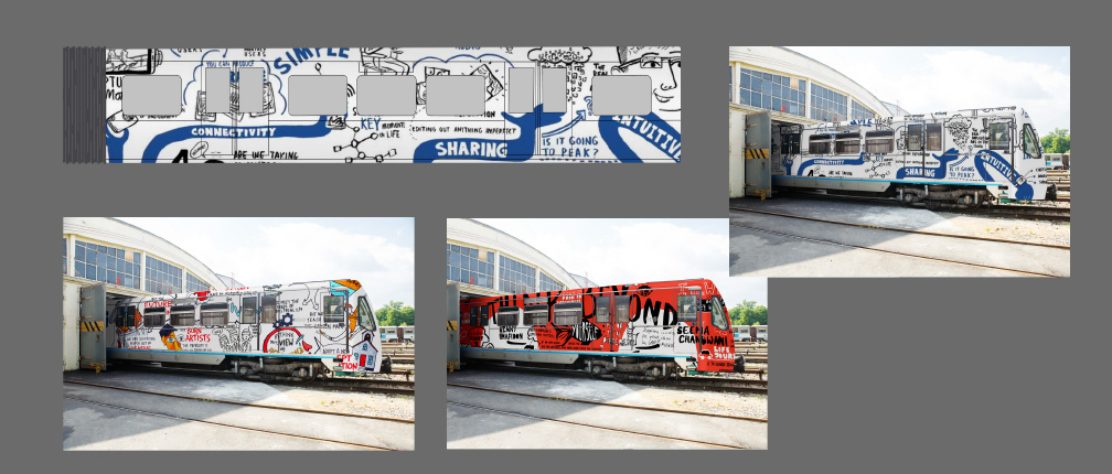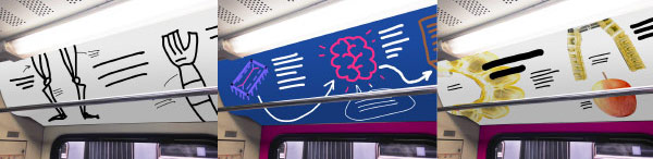 The art director asks to add linear illustrations to 3D objects. Since the new train has more space, lowering some of the facts on to walls.