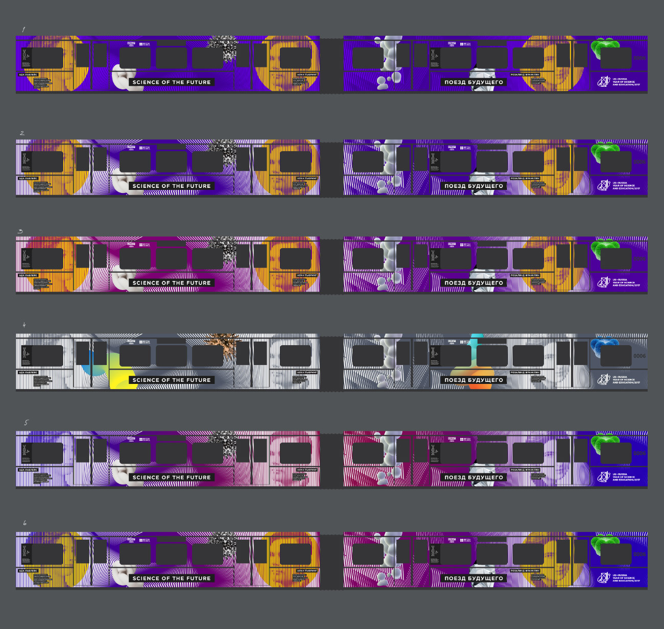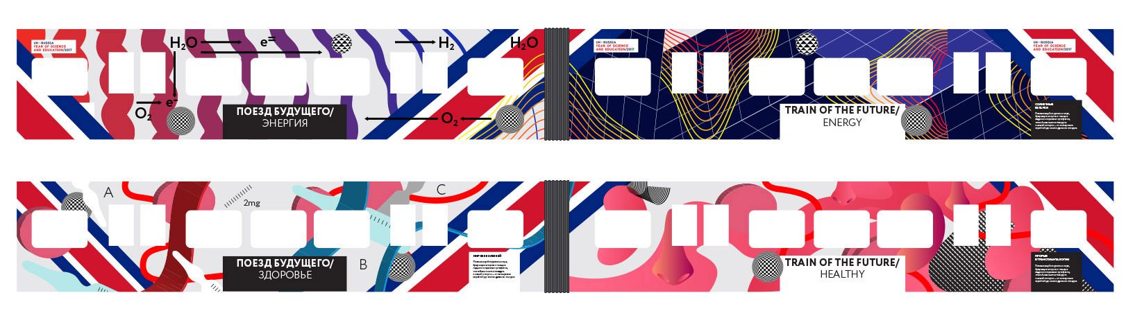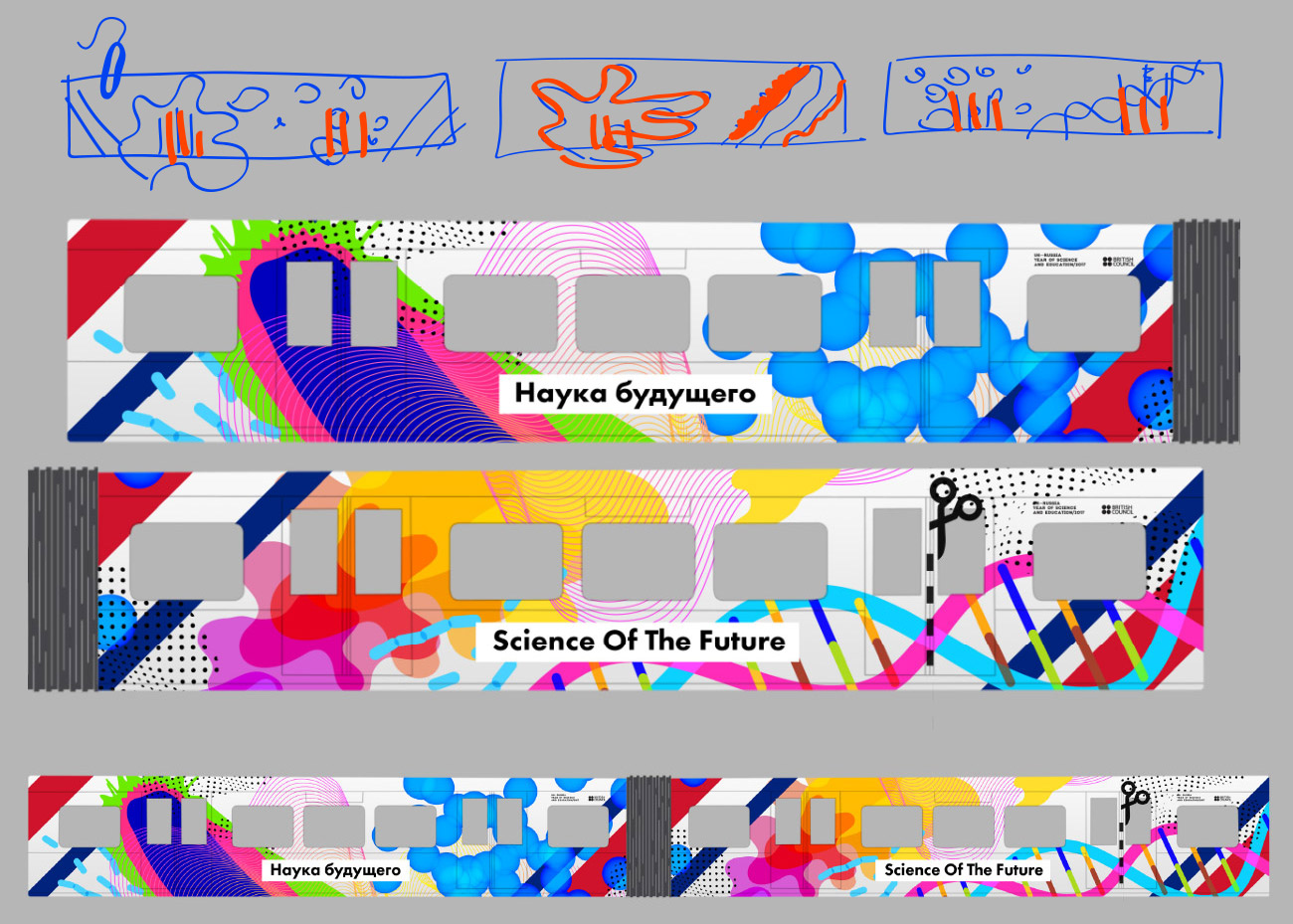 It’s also very important that in addition to being cool, the train is associated with Britain. It would be great to introduce the colors or elements of the British flag. The client also asks to simplify the science graphic elements: right now they are too abstract, making it difficult for viewers to understand that the train is about science.