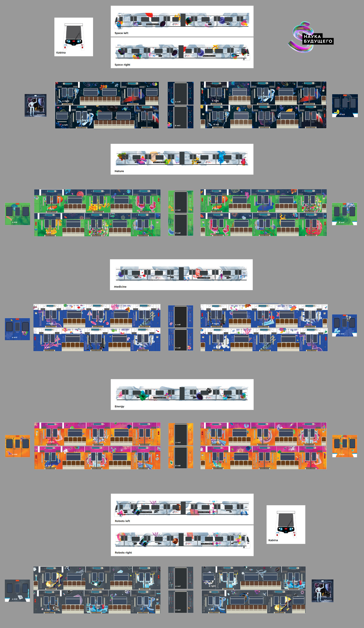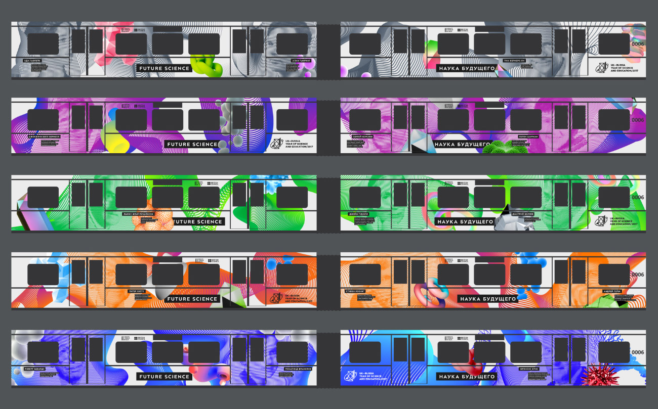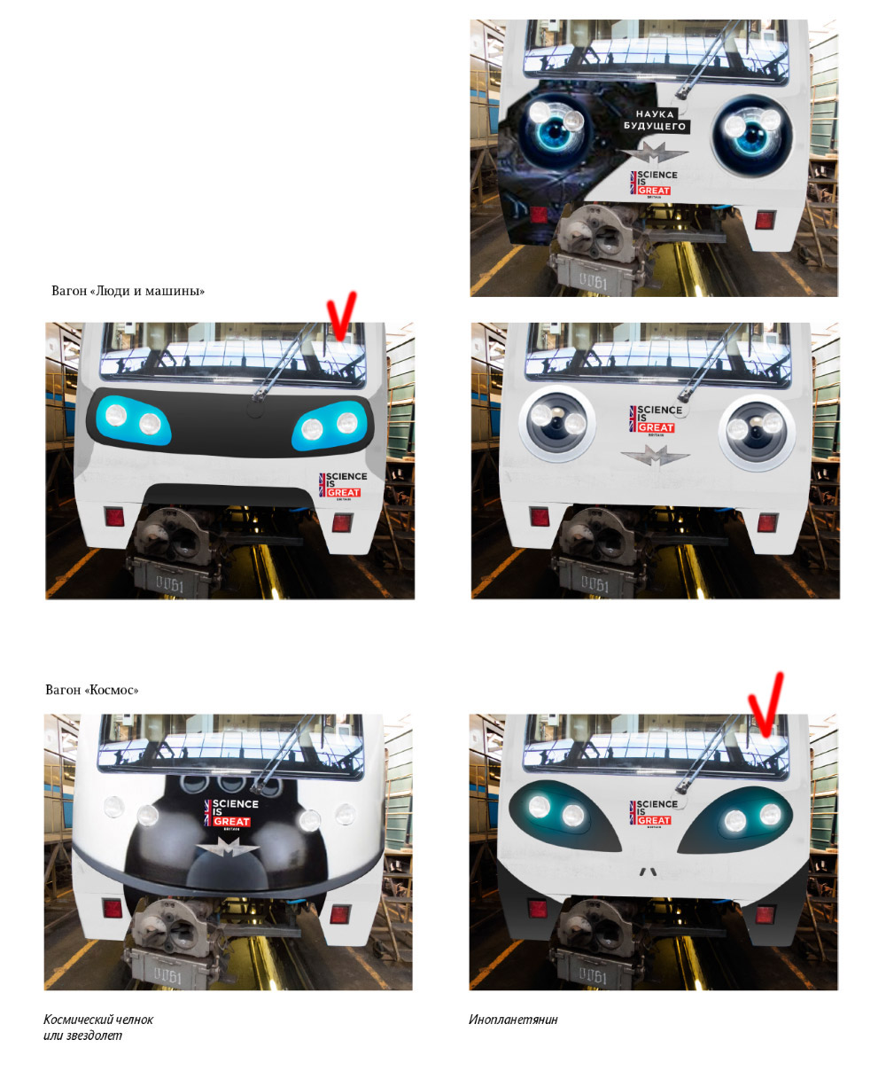 It’s also very important that in addition to being cool, the train is associated with Britain. It would be great to introduce the colors or elements of the British flag. The client also asks to simplify the science graphic elements: right now they are too abstract, making it difficult for viewers to understand that the train is about science.