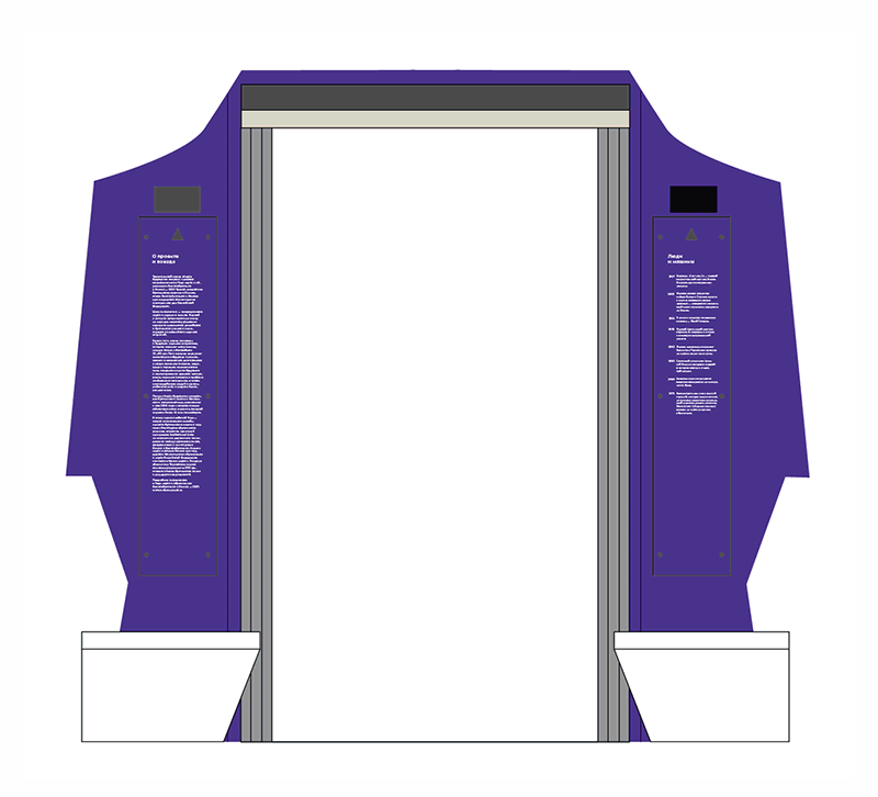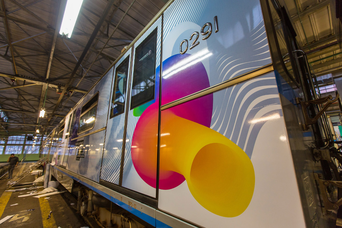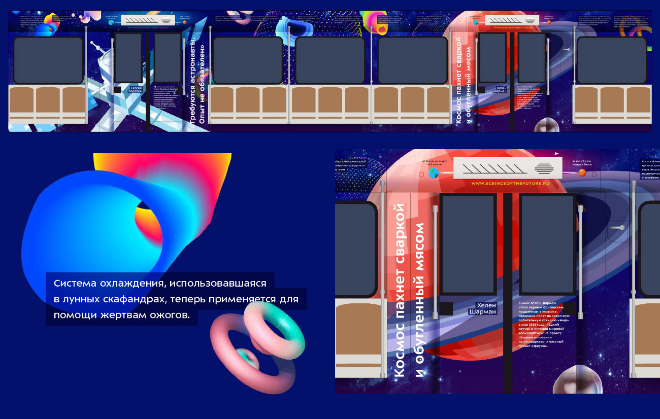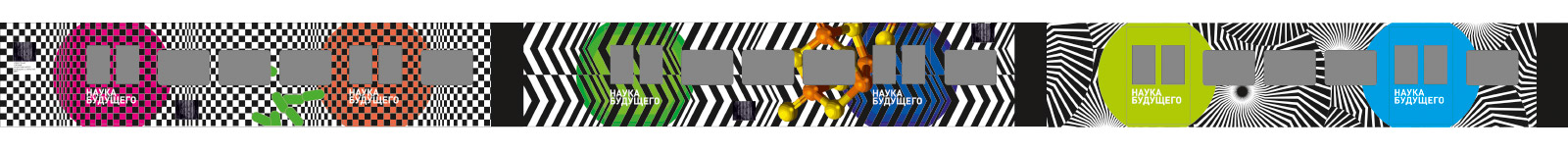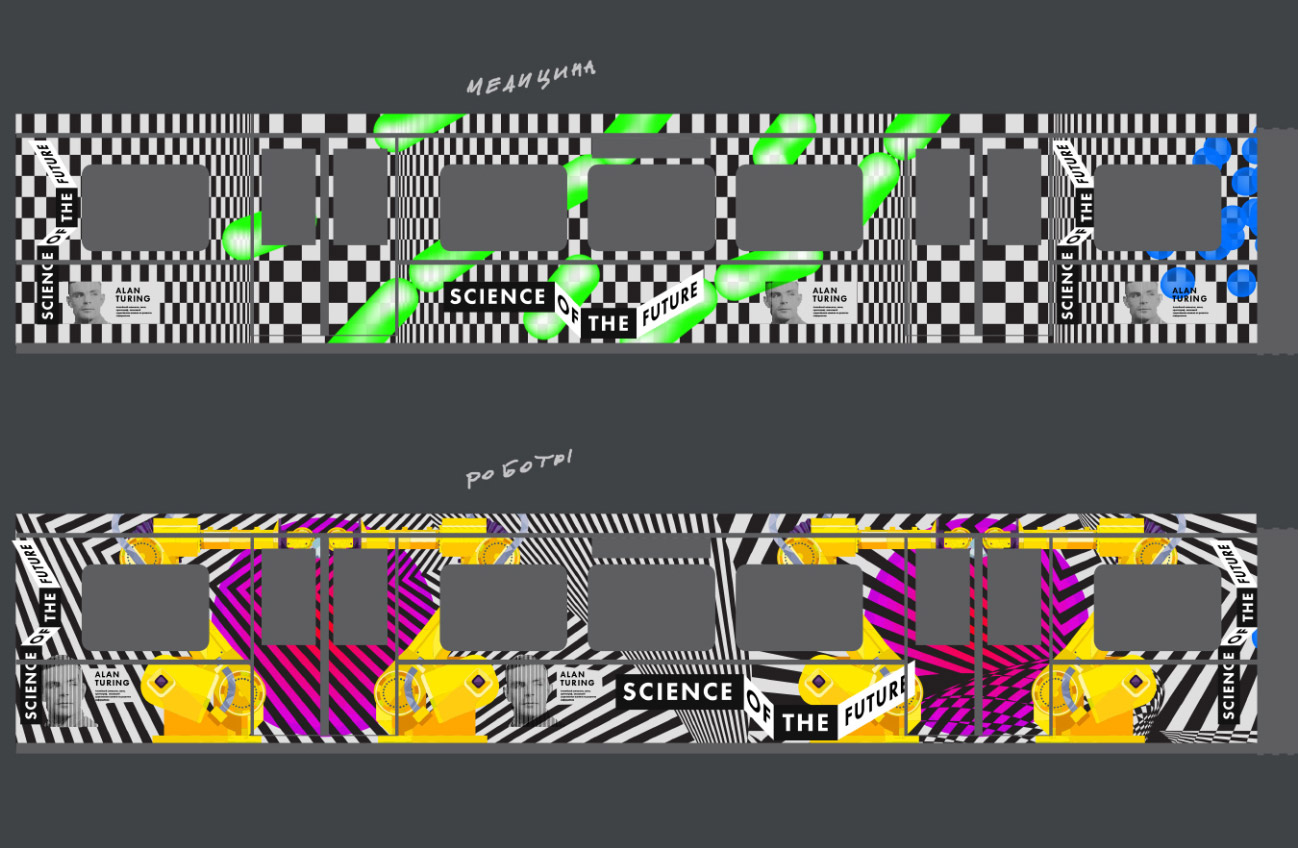 Now for the design solutions. We imagine a solid white background for the exterior with laconic red (navy) graphic elements. First of all, white alludes to the future, secondly, we’ve never seen white Metro trains before and finally, it’s a reference to the logo of the project. Can we try this idea out and see what it looks like? Outside, laconic and minimalist, with hashtags #sciencetrain and #научпоезд.