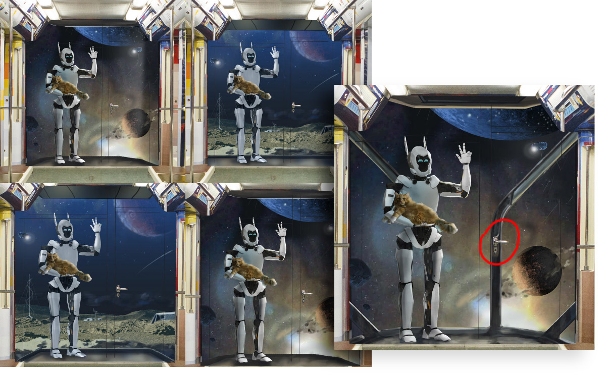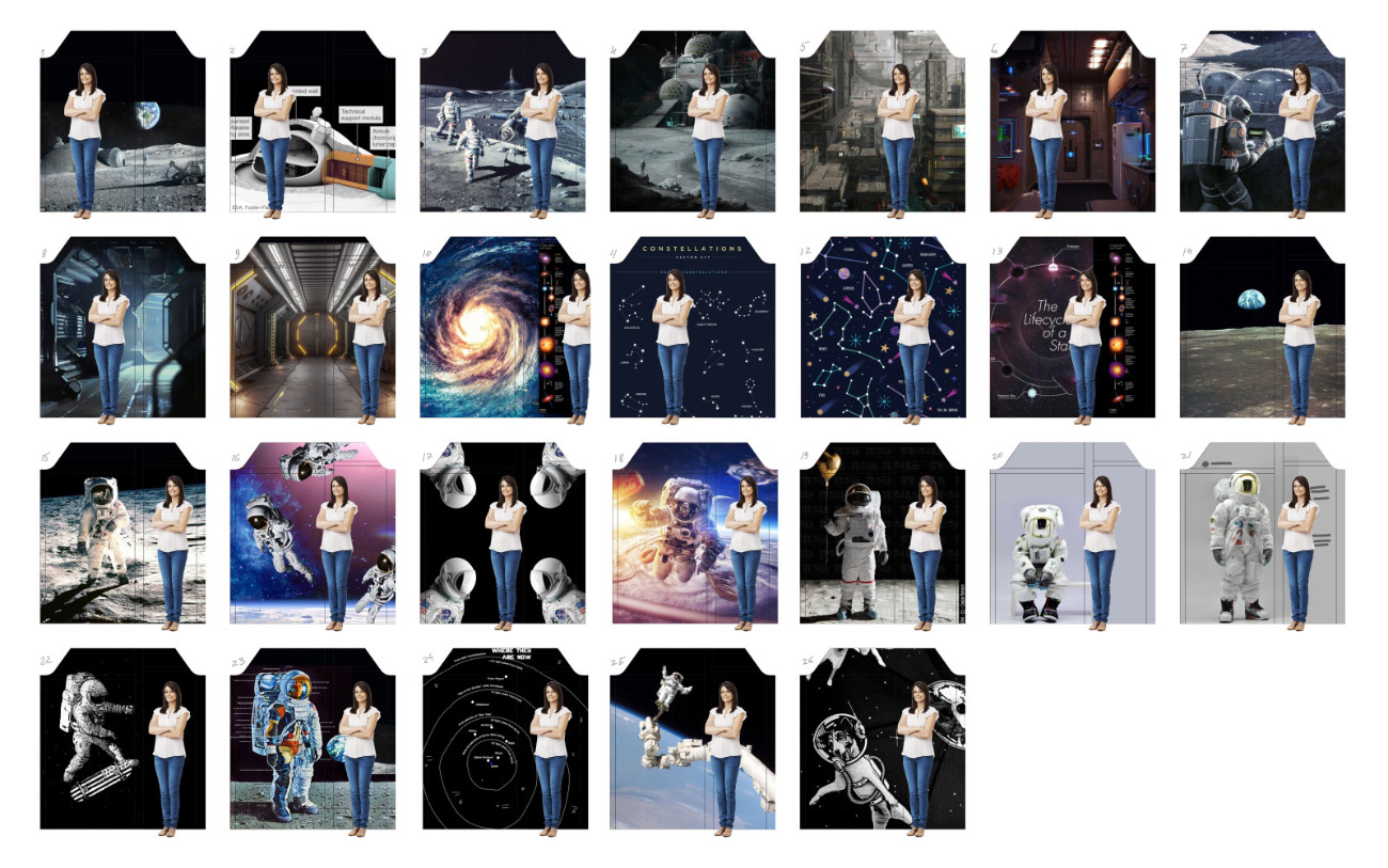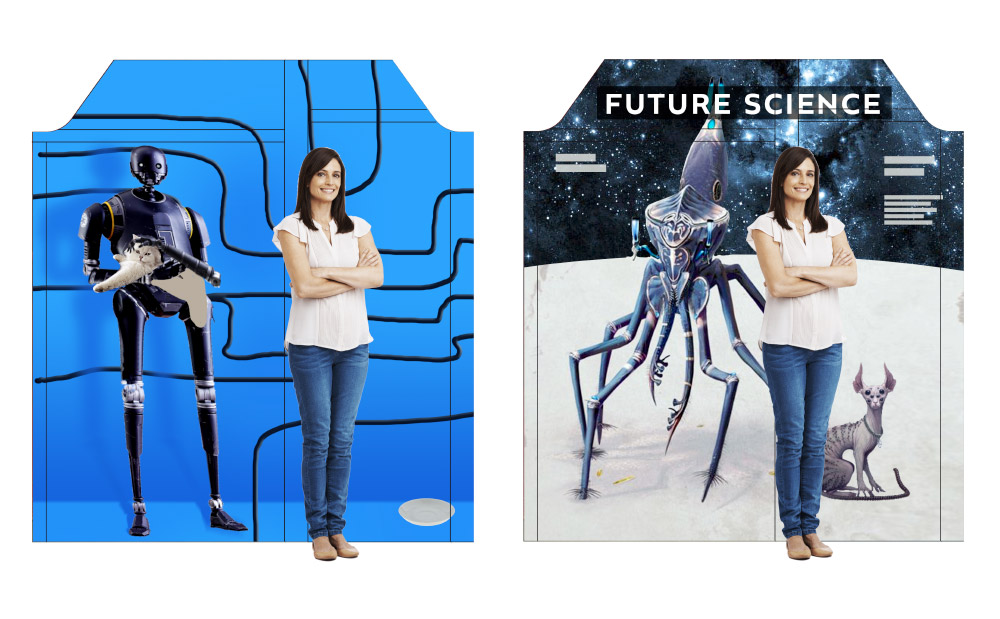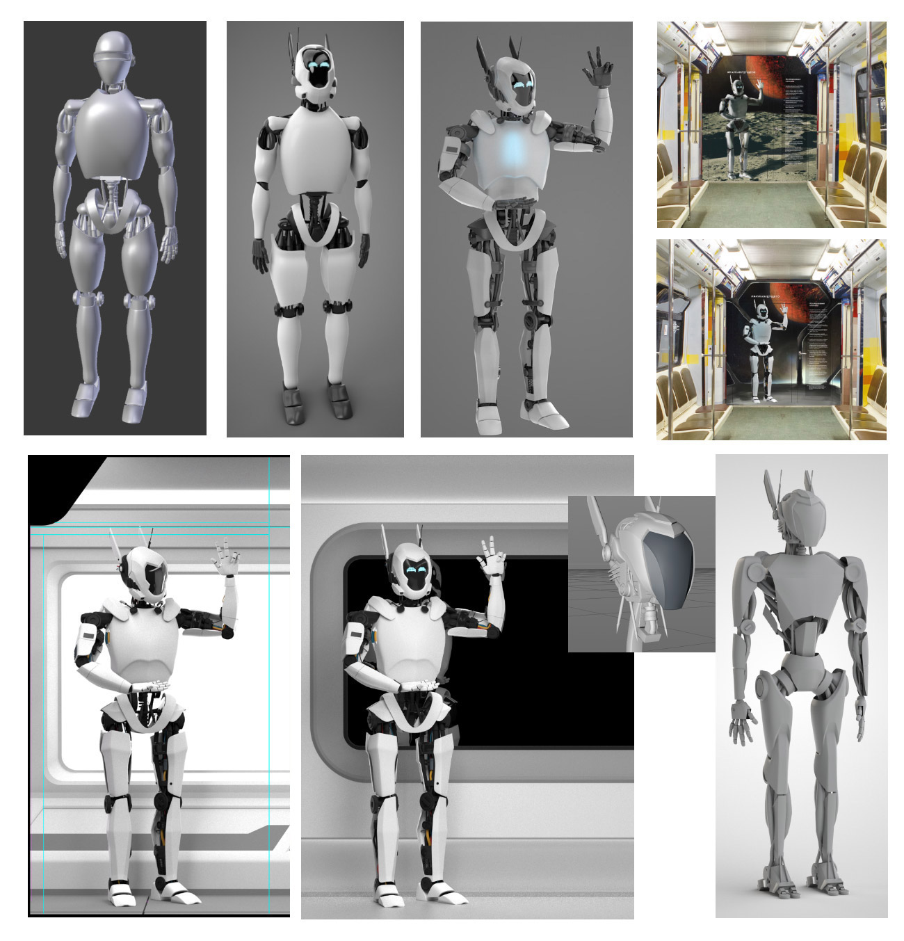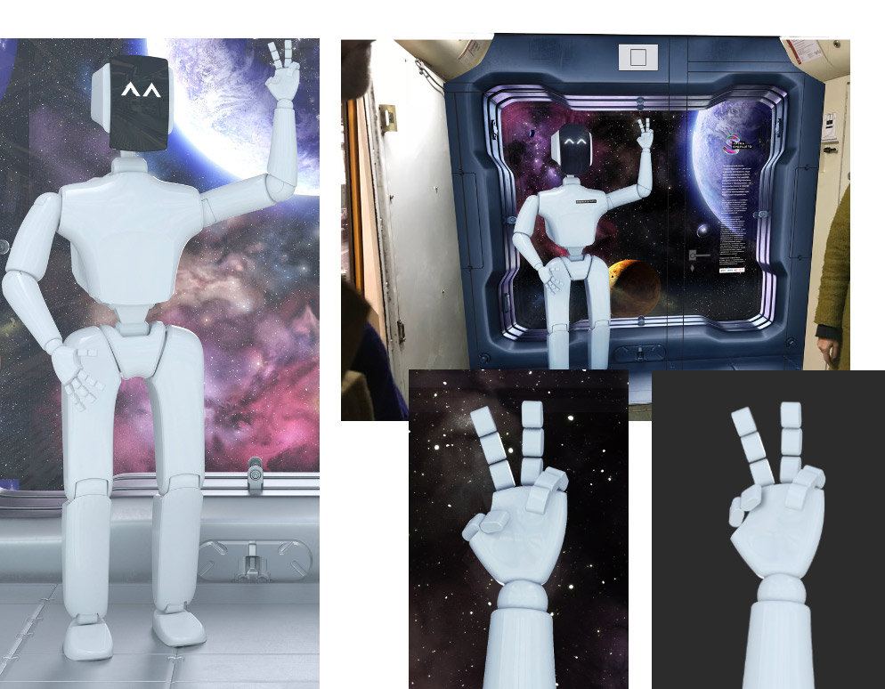 Meanwhile, the work on selfie spots is under way. The client really wants there to be a no-name robot (to avoid any copyright issues). Deciding to combine it with the space theme and use in the two end cars: Humans and Machines and Space.