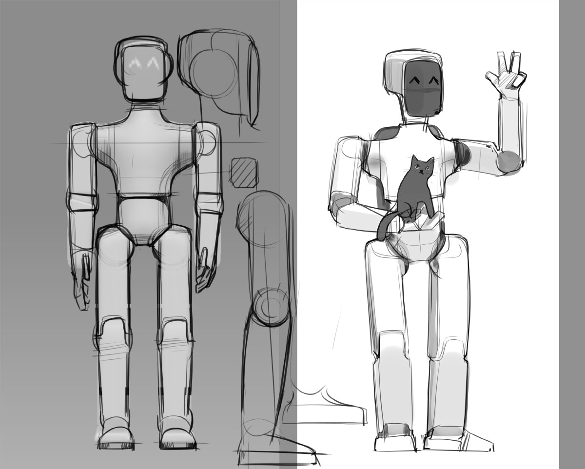Bending the thumb, trying to make sure the robot doesn’t look like he had a circular saw accident. Despite our best efforts, the client insists we remove the cat :(