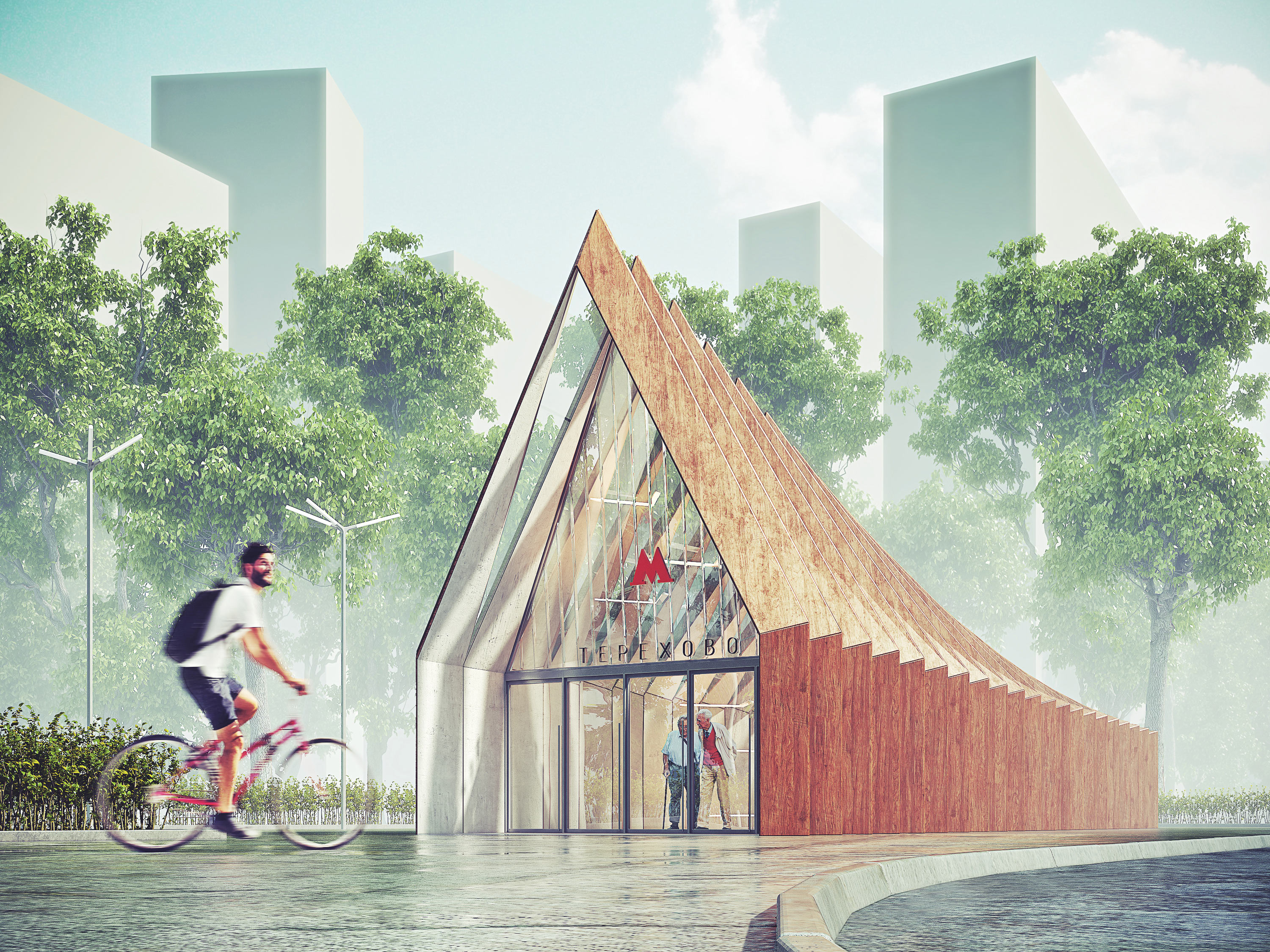 Terekhovo is an actual village within Moscow city limits complete with wooden huts, rickety fences, orchards, flowering gardens, ravines and countless trails. Terekhovo Metro station is set to open in 2018, when high-rise buildings and business centers take place of the village. A concept of the appearance of Terekhovo Metro station that brings the rural aesthetics into the high-tech underground world was created at the studio.