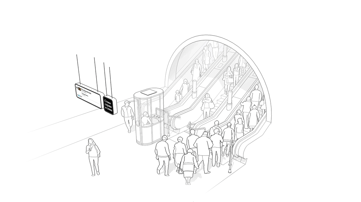 In Russian Metro, when going up on an escalator passengers tend to stand on the right side and leave an empty space on the left for passengers walking up. This habit is so strong that in peak hours the left side of the escalator can become completely empty. The traffic light developed at the studio indicates when to use the entire width of the steps.