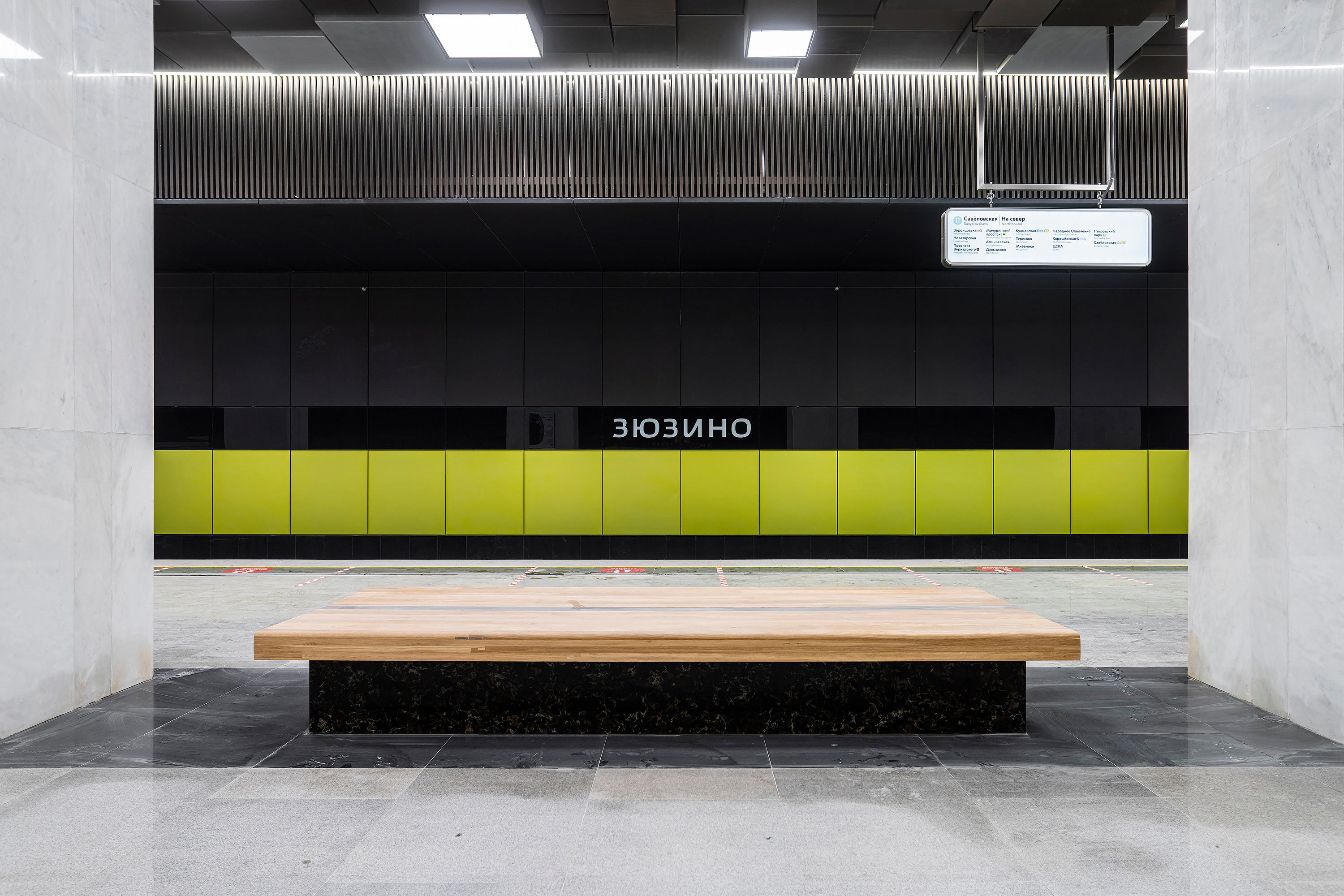 The interior of the station is rendered in a strict technological style. The ceiling is decorated with aluminum plates of different sizes with built-in lights.
