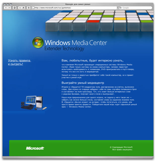 Microsofts promotion event is held until December 10. The winner of the contest is awarded Media Centeran operating system that turns your home PC into an entertainment center. ![]() To take part in the contest and get a copy of Windows Media Center, the users have to play Scrabble. |