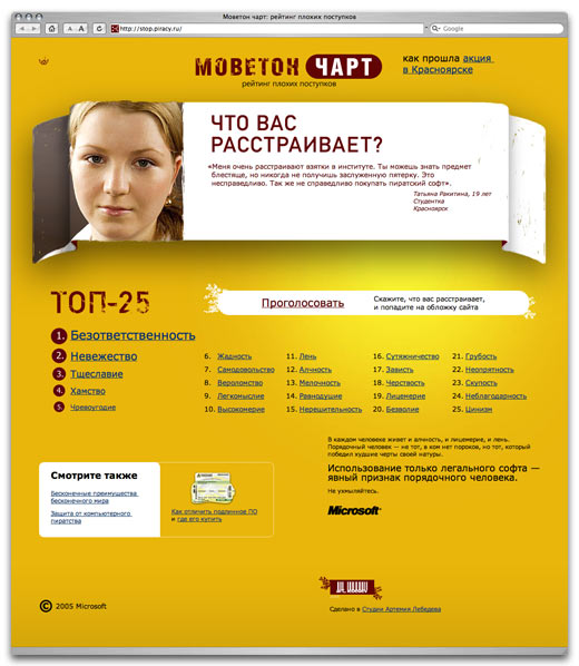 The website features the rating of ill acts. Visitors are suggested voting for the three of those they believe are the most aversive, and giving examples from their life experience. The winner who is chosen based on the results of the vote should guess the most “popular” sin, provide a convincing description of it, and prove that using pirate software is unacceptable. The portrait of the winner and his or her exhortation are monthly published on the main page of the website.