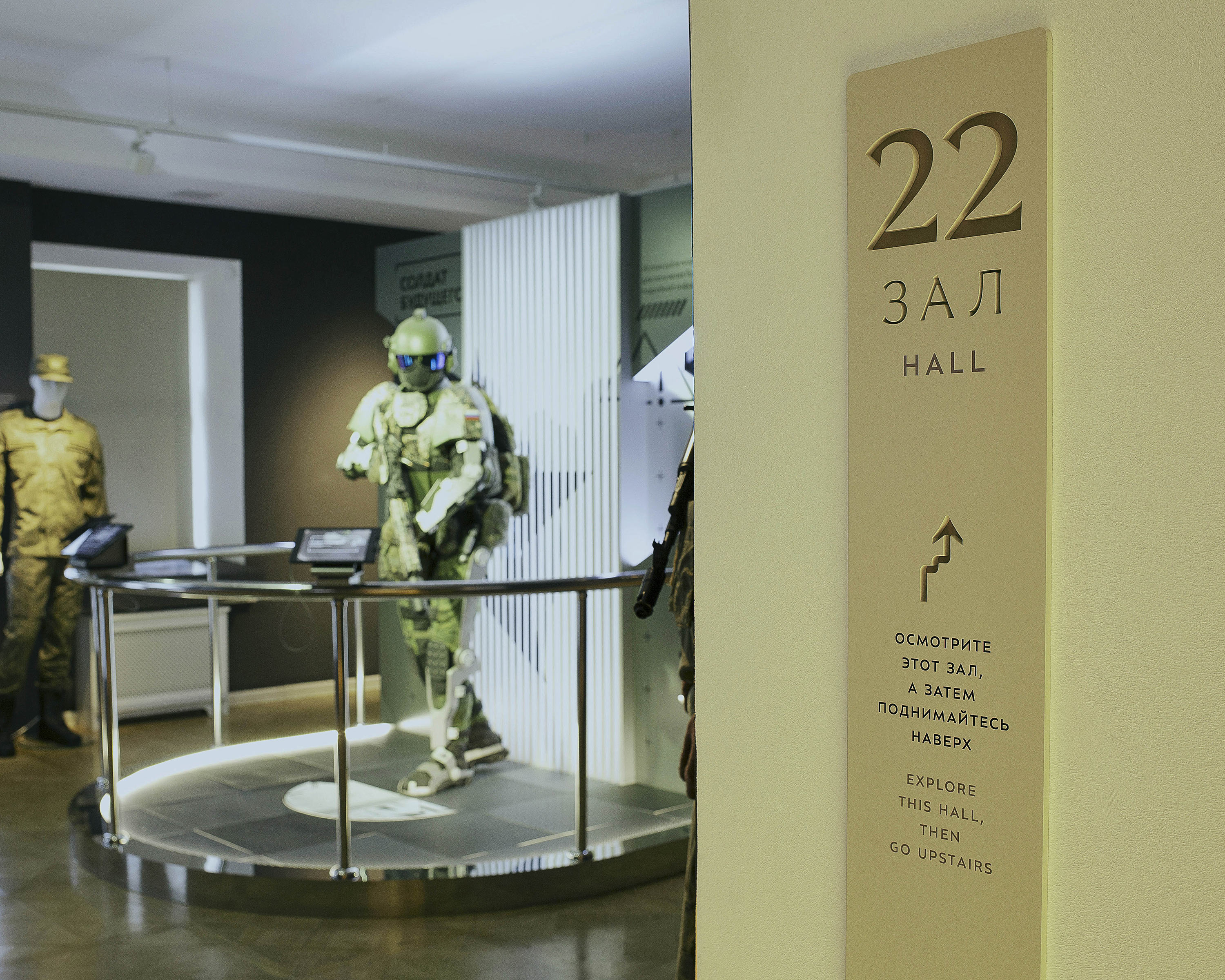 The museum communicates with the visitors through the wayfinding system in a friendly, but military-like clear and laconic way. The system is based on clear numbering of the halls, while the laconic hints prevent visitors from getting lost.