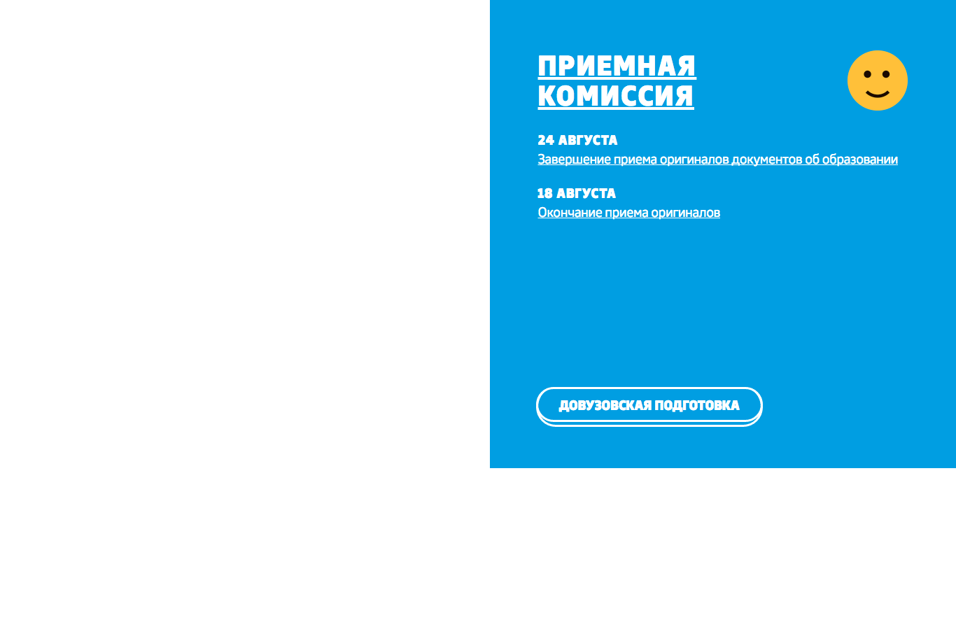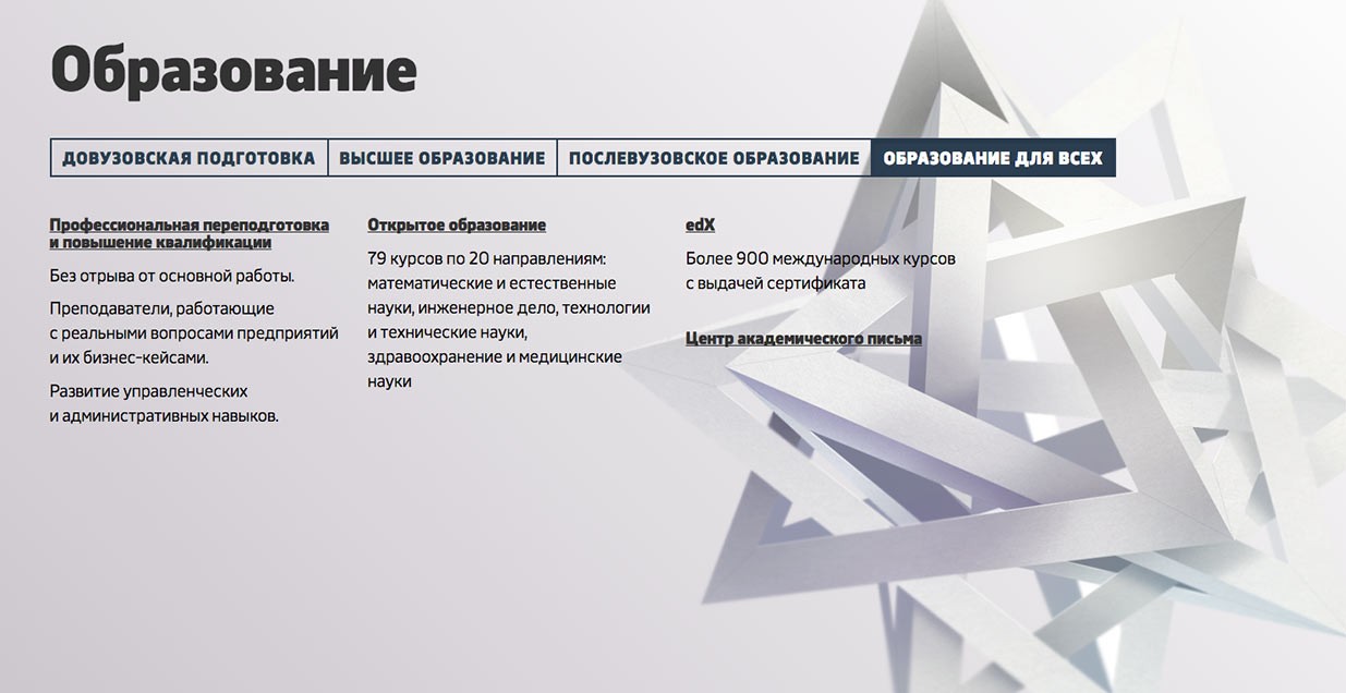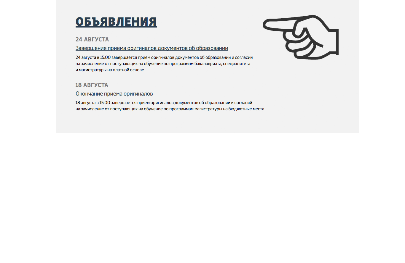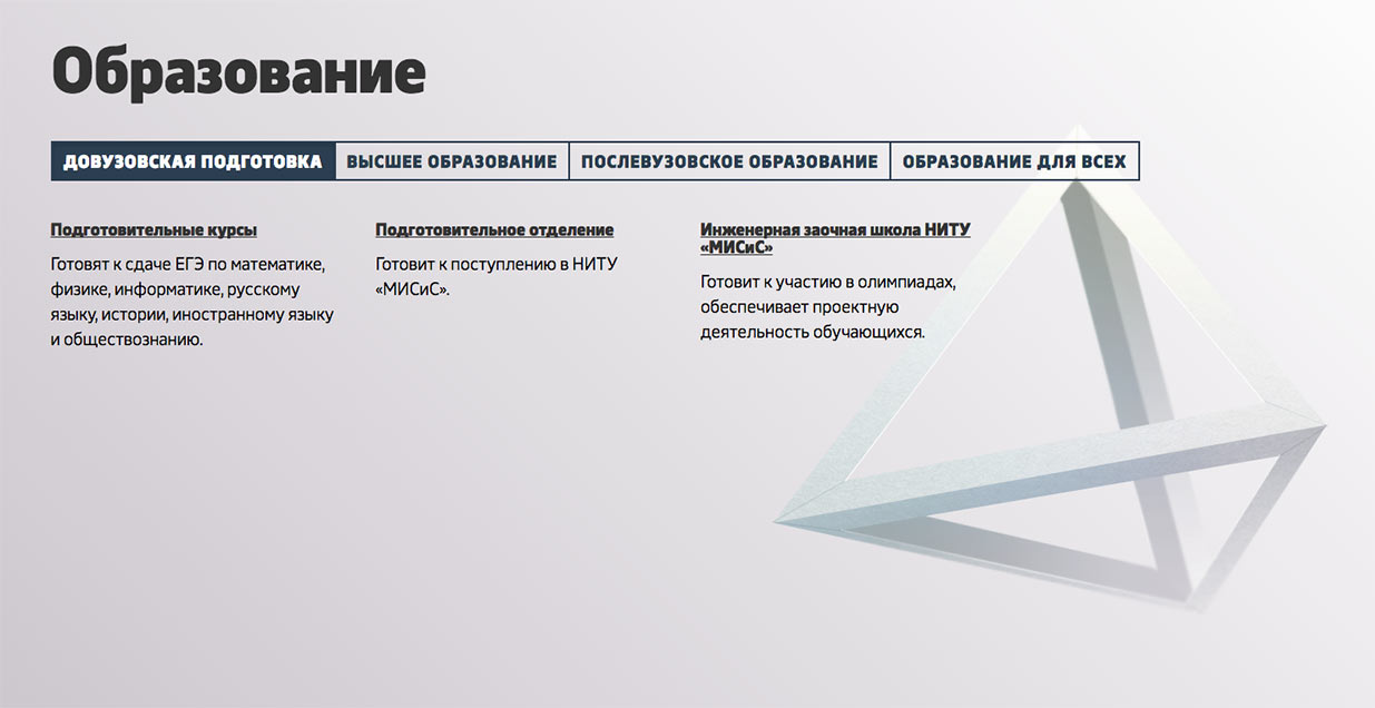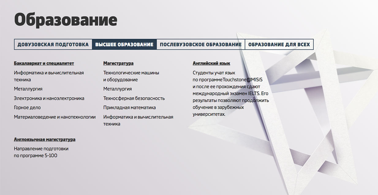 Style of blocks with information about the university is more strict due to a lower number of decorative elements. Some of the pages have pleasant graphics that can turn a common gray block into a sheet of paper or illustrate a story with a metaphoric background.