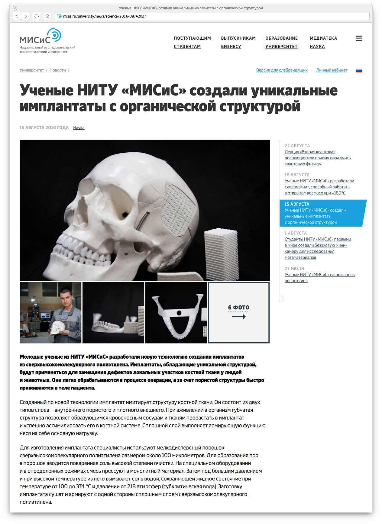 National University of Science and Technology MISiS was founded in 1918 as the Moscow Mining Academy. Today, the university specializes primarily in research and ranks 9th among Russian universities in the Times Higher Education rating. MISiS houses international laboratories where employees and students create medical biomaterials, improve methods of diagnosis and treatment of diseases, develop ultralight materials and search for their new applications. Every aspect of the research center’s life is structured and presented on the pages of the website.