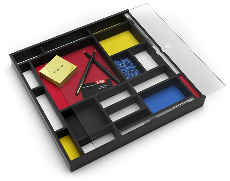 This design was inspired by one of Mondrian’s paintings. Mondrianum box is divided into twenty different size sections. The narrowest three are not as deep as the rest.