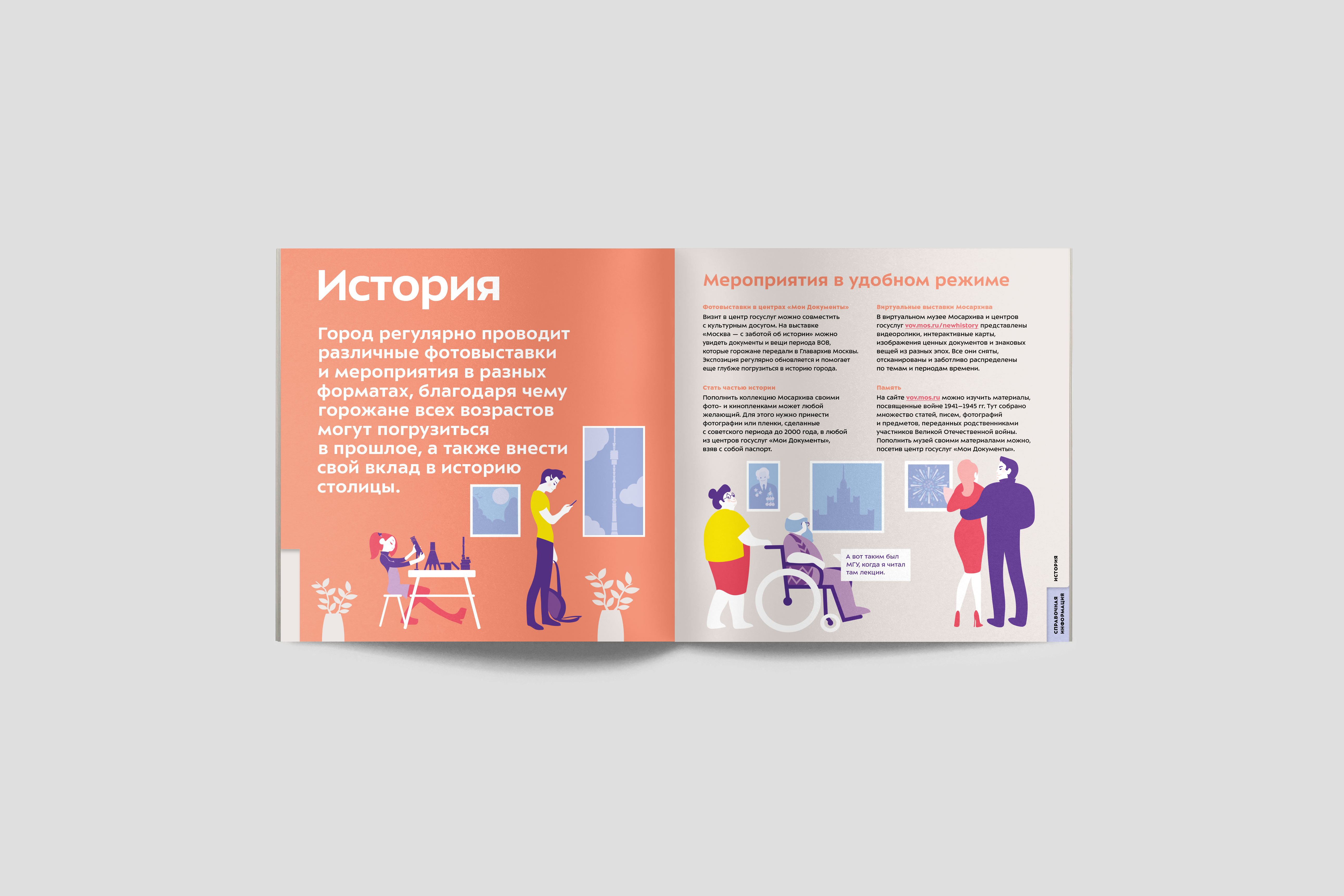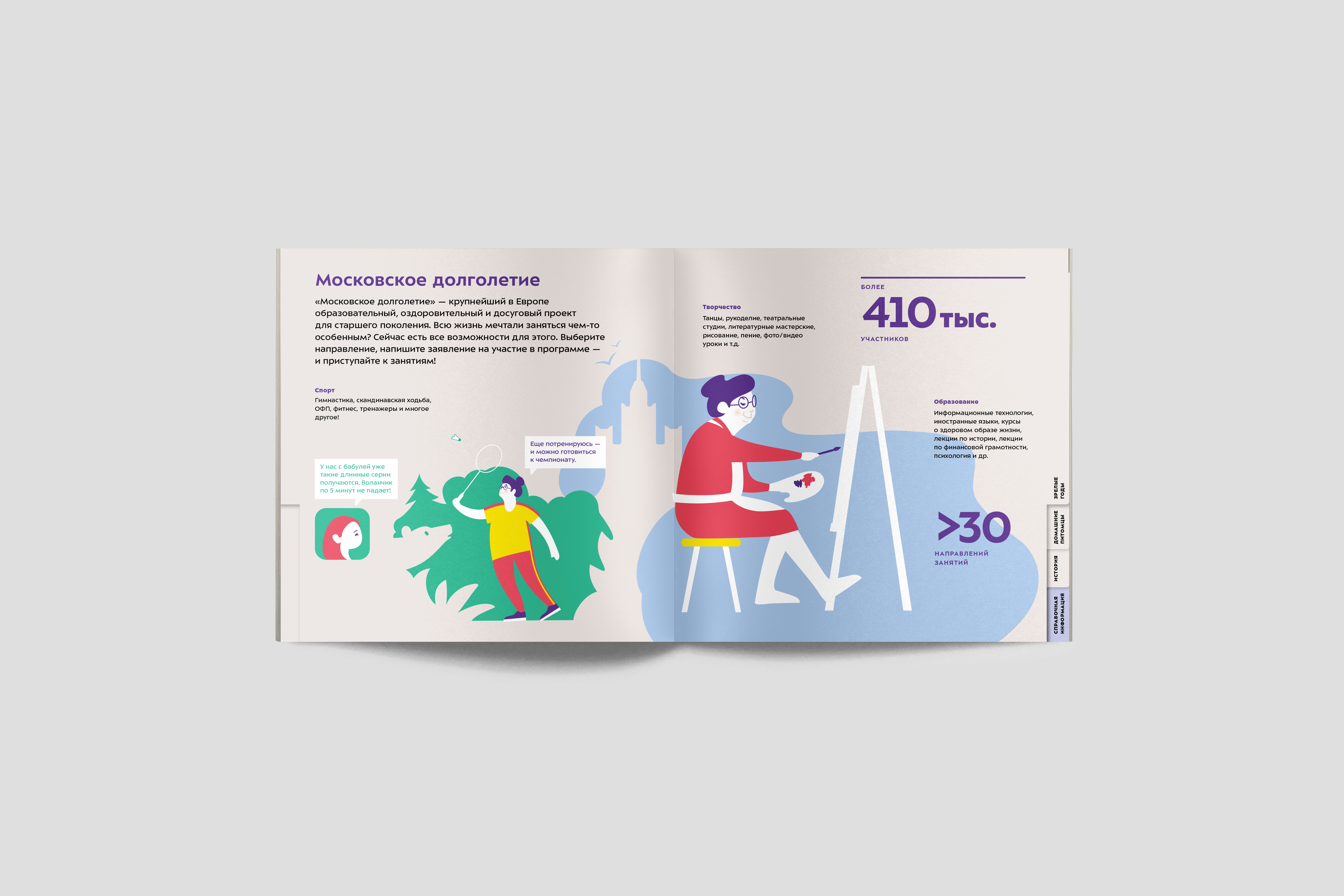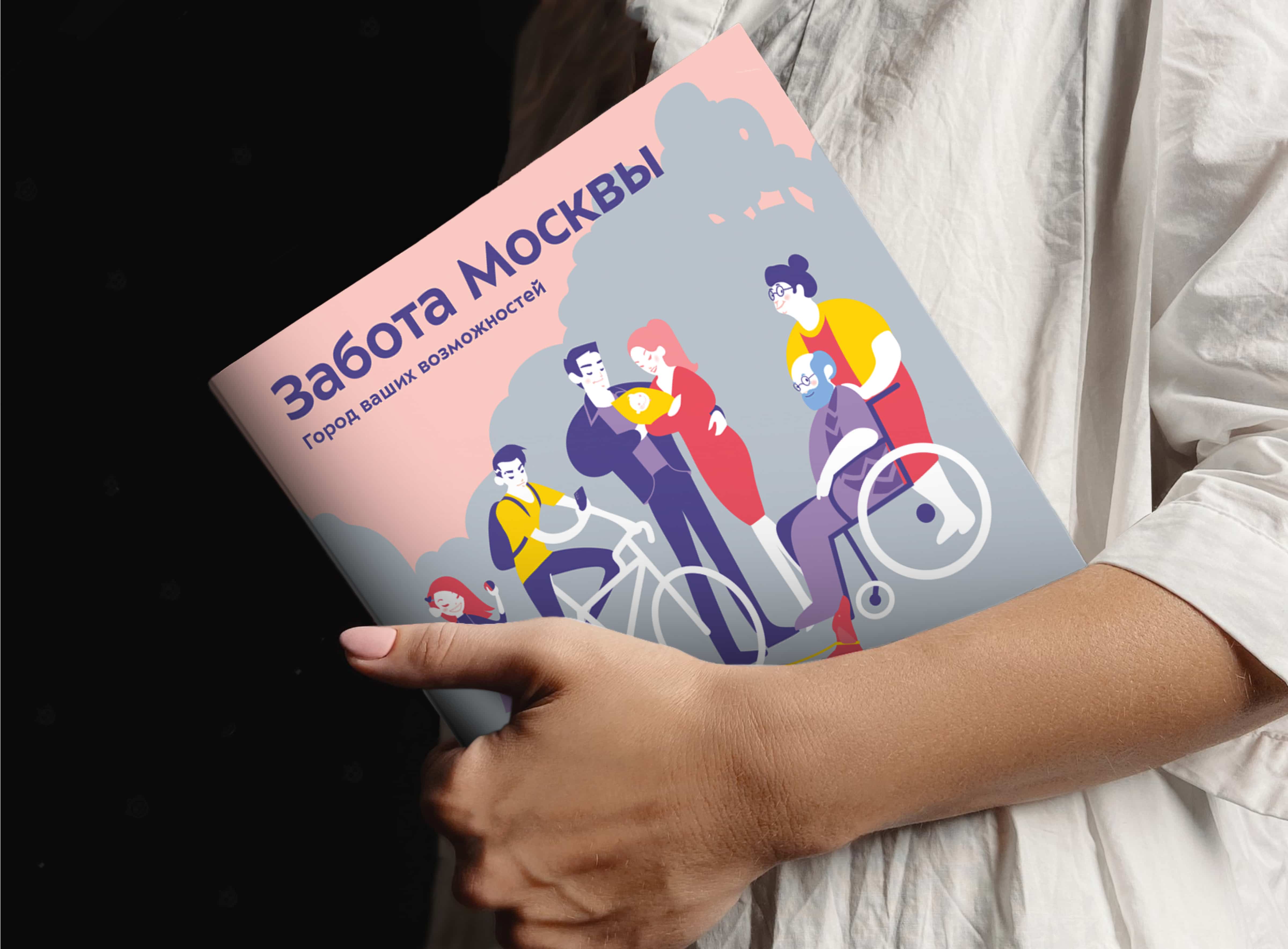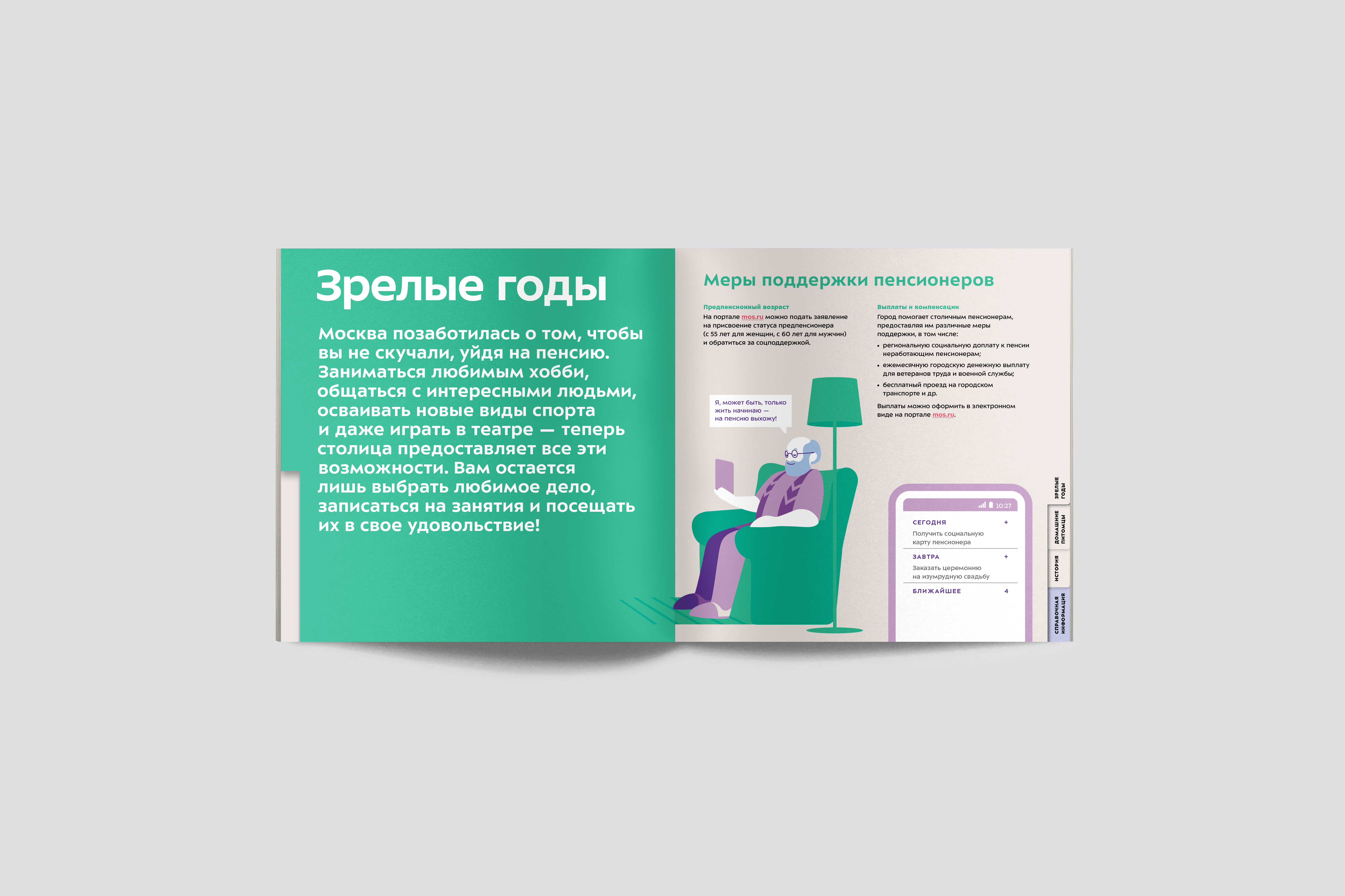 Moscow takes care of its residents, helping them with everyday activities, at work and even at leisure. For each type of activity, the city has a project to offer that will make it easier to perform routine actions and solve complex issues. Together with specialists from the Moscow Social Development Complex, studio designers composed and designed a book that describes all stages of life of a Moscow resident from early childhood to old age and tells how the city participates in them.