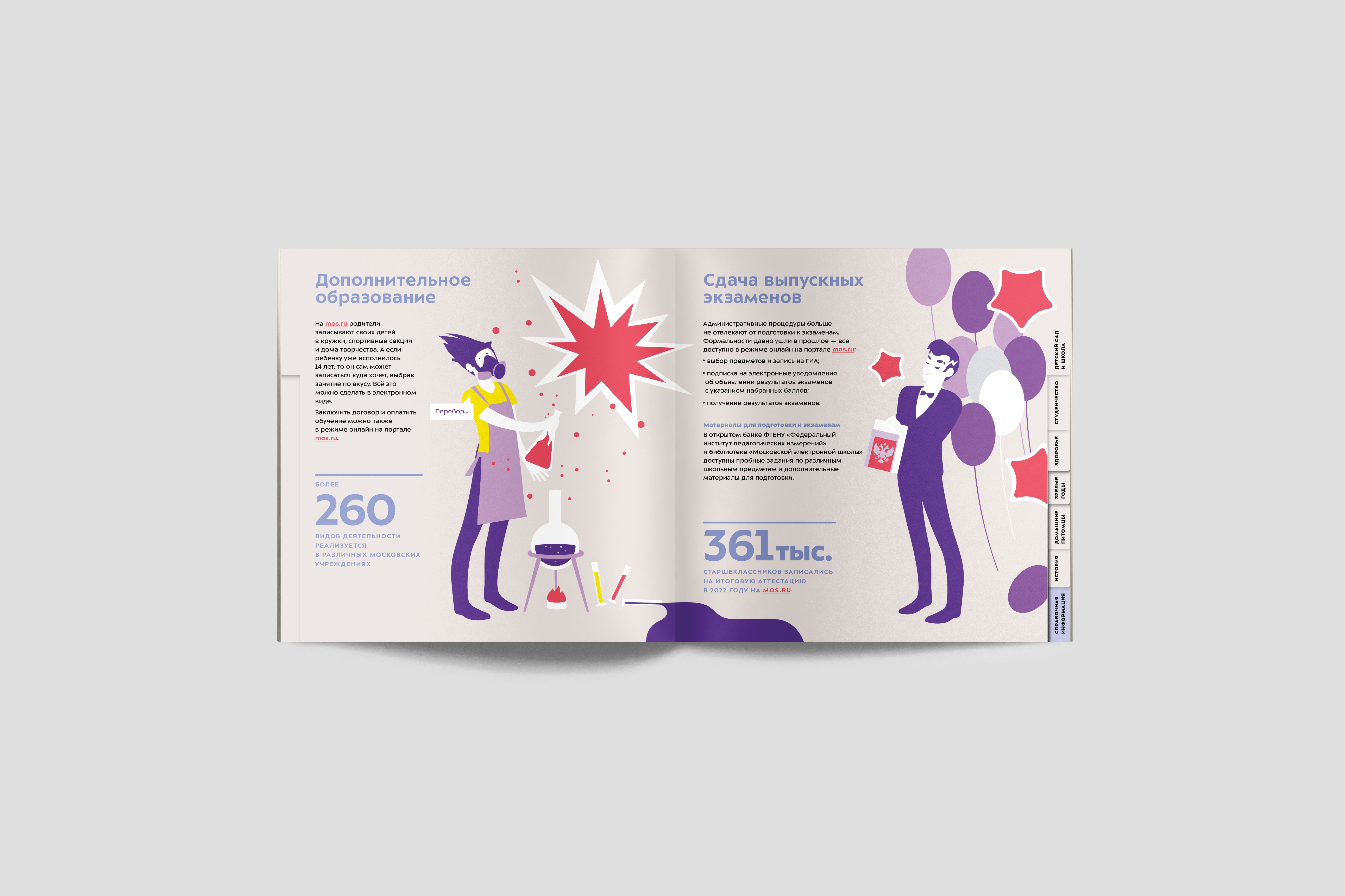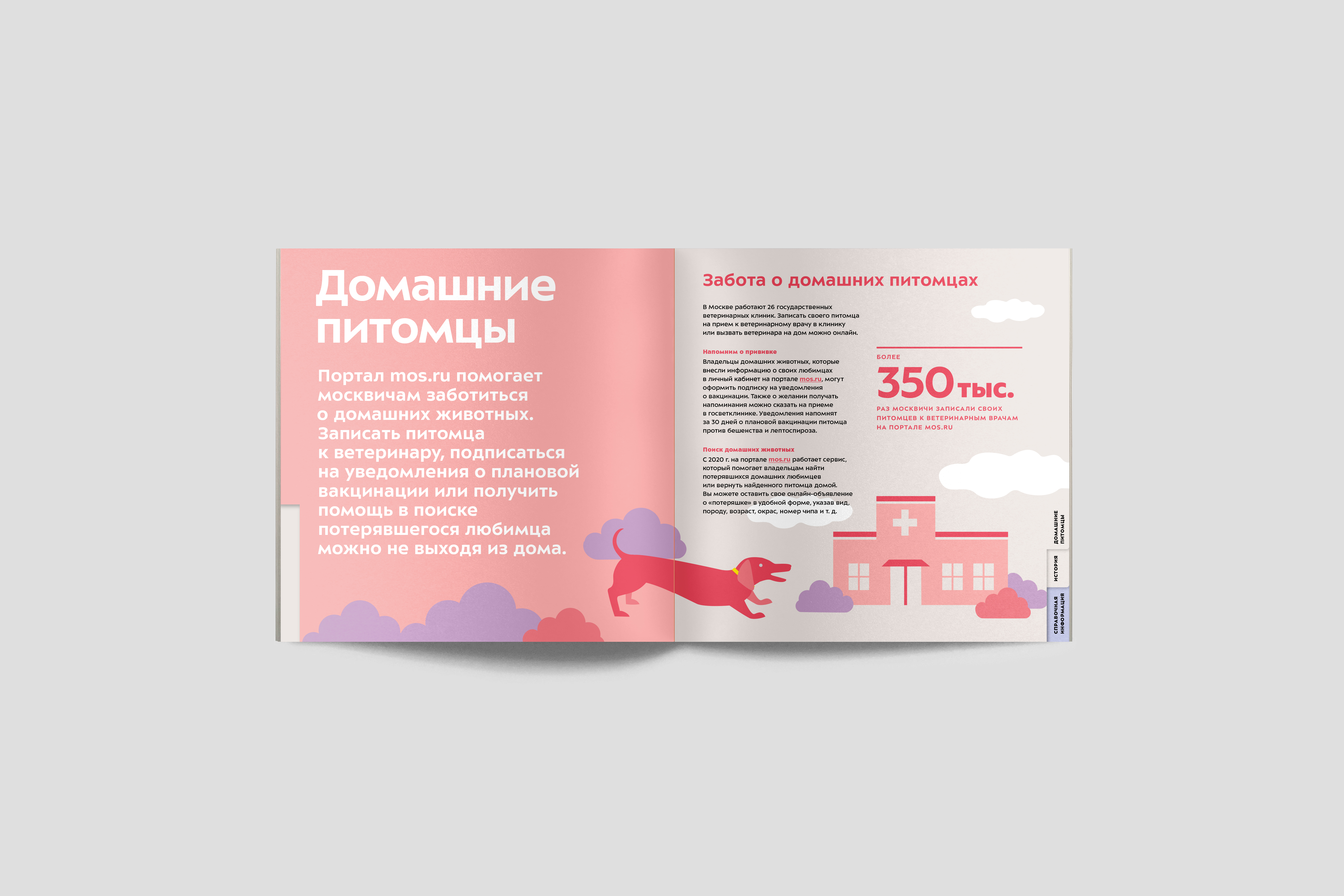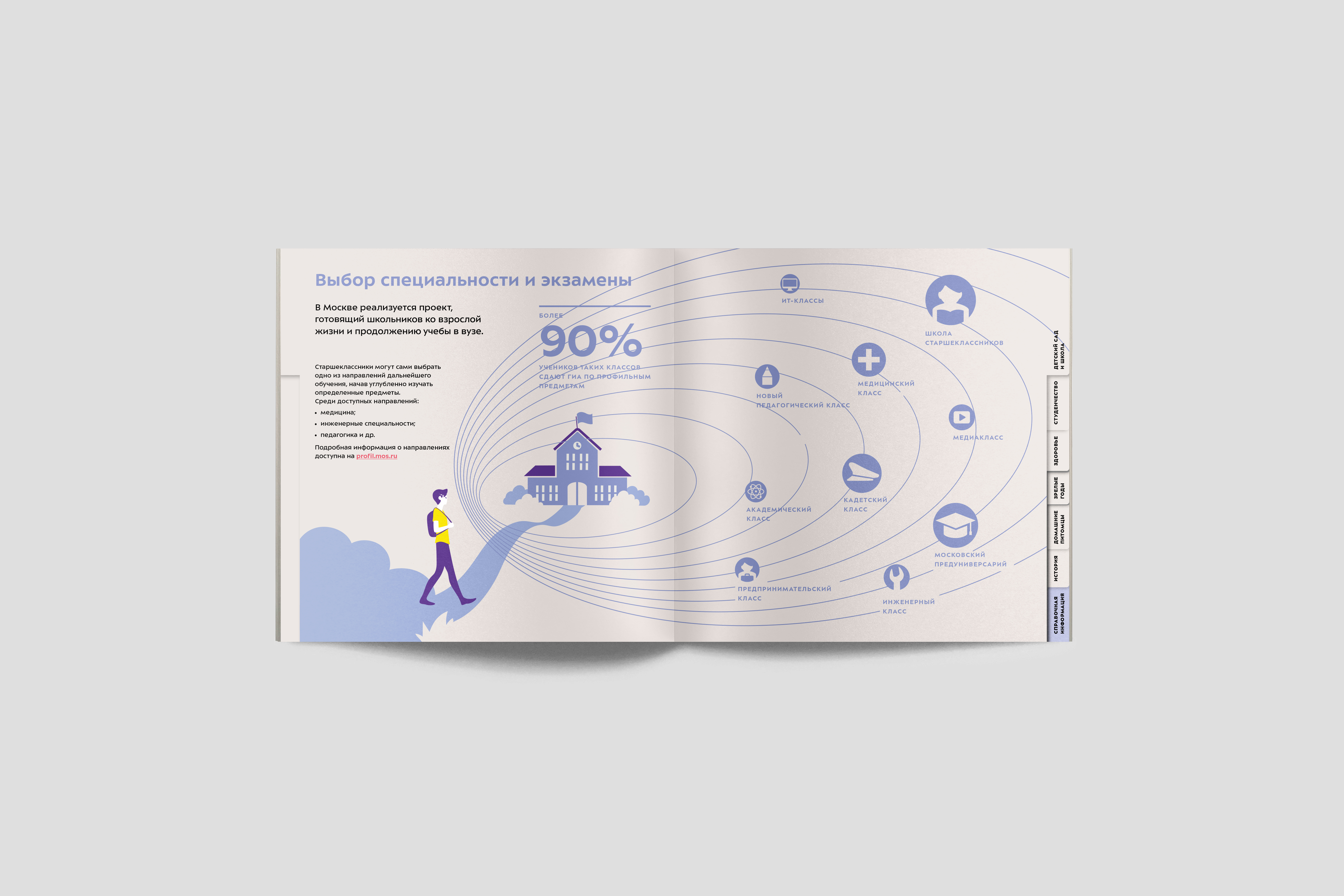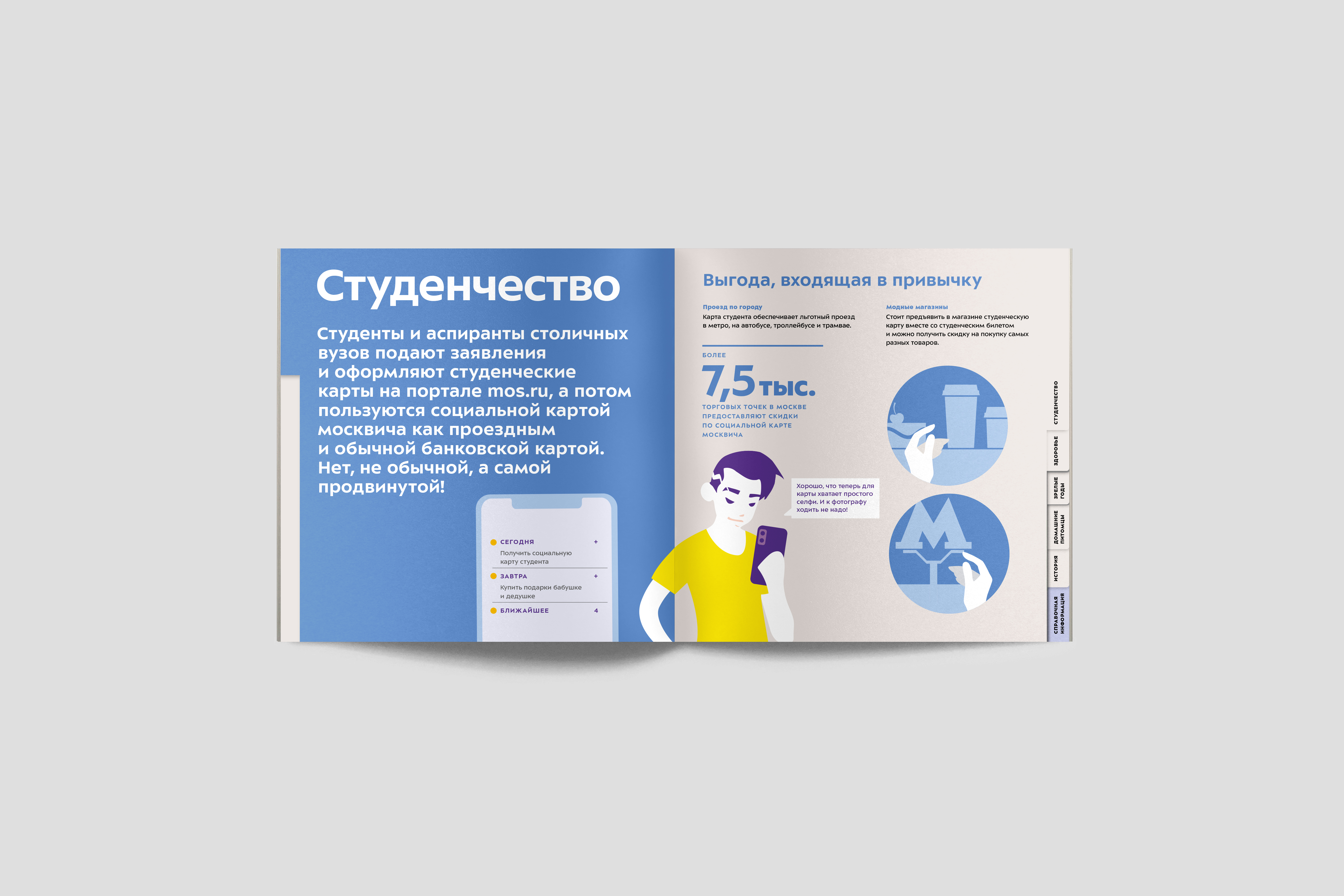 Moscow takes care of its residents, helping them with everyday activities, at work and even at leisure. For each type of activity, the city has a project to offer that will make it easier to perform routine actions and solve complex issues. Together with specialists from the Moscow Social Development Complex, studio designers composed and designed a book that describes all stages of life of a Moscow resident from early childhood to old age and tells how the city participates in them.