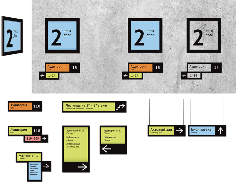 Meanwhile, the designers have developed a system of navigation elements for cultural centers: arrows, frames, colored and black boxes, materials, production and placement methods. For future use, we have also incorporated signs in English for foreign visitors.