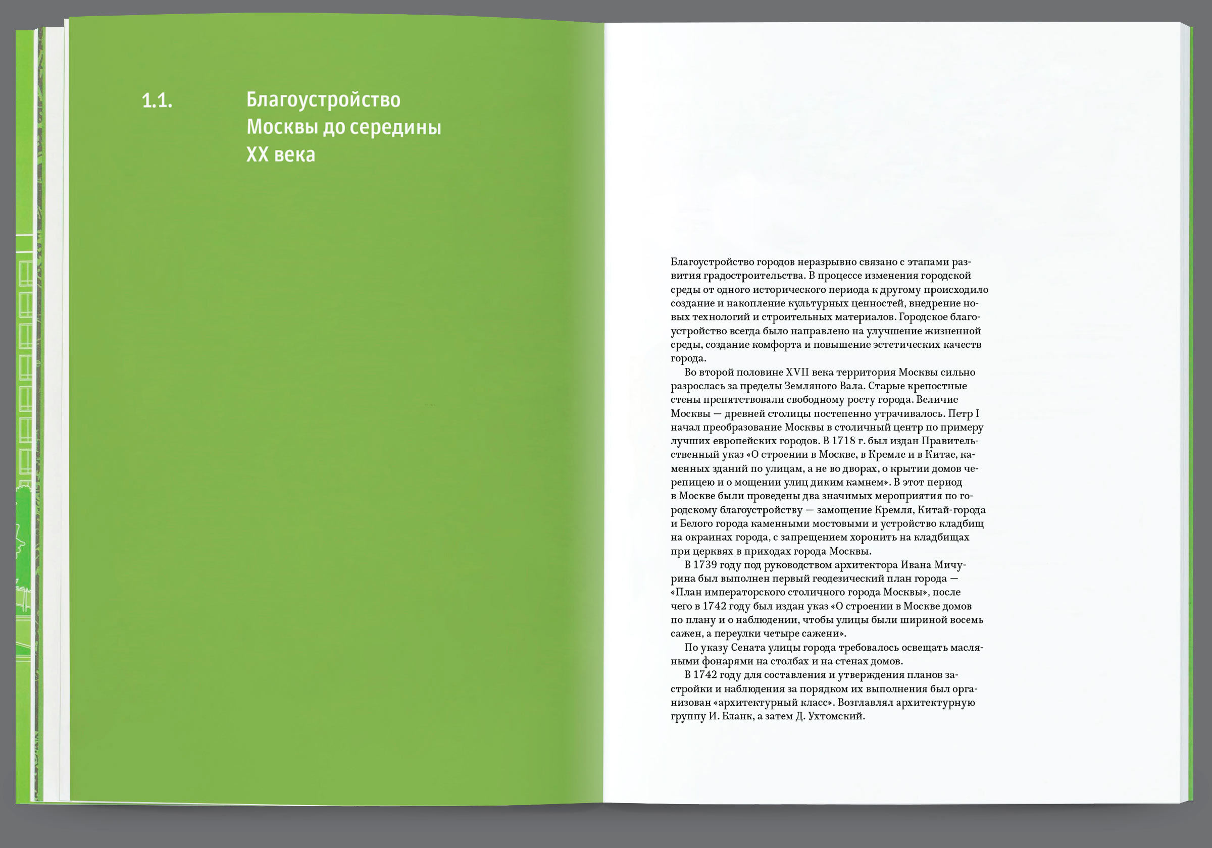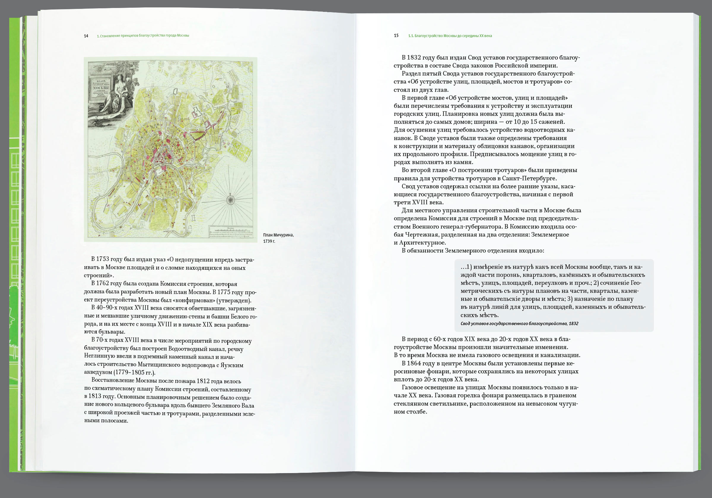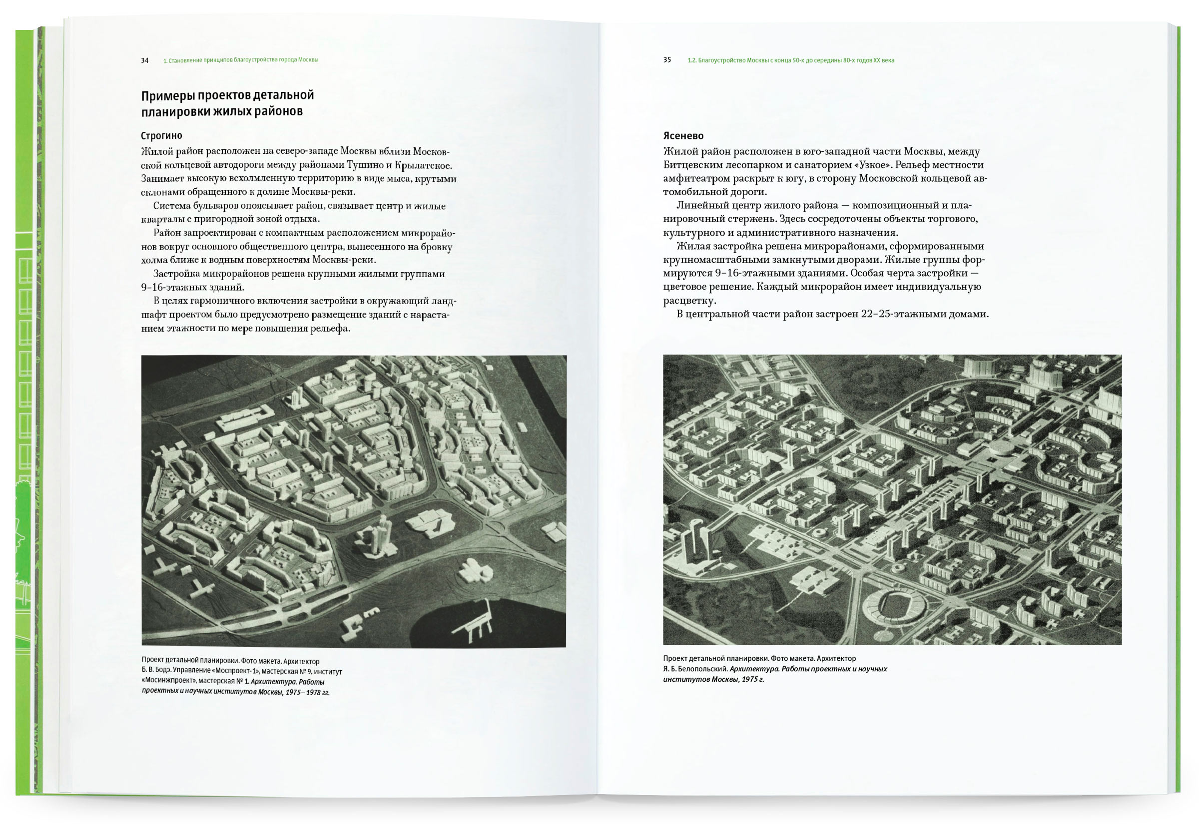 The architects have thoroughly investigated the problem: they explored the history of the issue from the ancient times and studied the experience of other countries. The first chapter of the book talks about the first steps in city planning made by Peter the Great and about the historic approach to urban planning. It mentions Michurin’s plan, the New and Large Moscow, Soviet architectural ensembles and the first plans for standard development of residential areas—all important milestones in the city’s history. Interesting illustrations from reference books of the past were carefully scanned and presented in their original form.