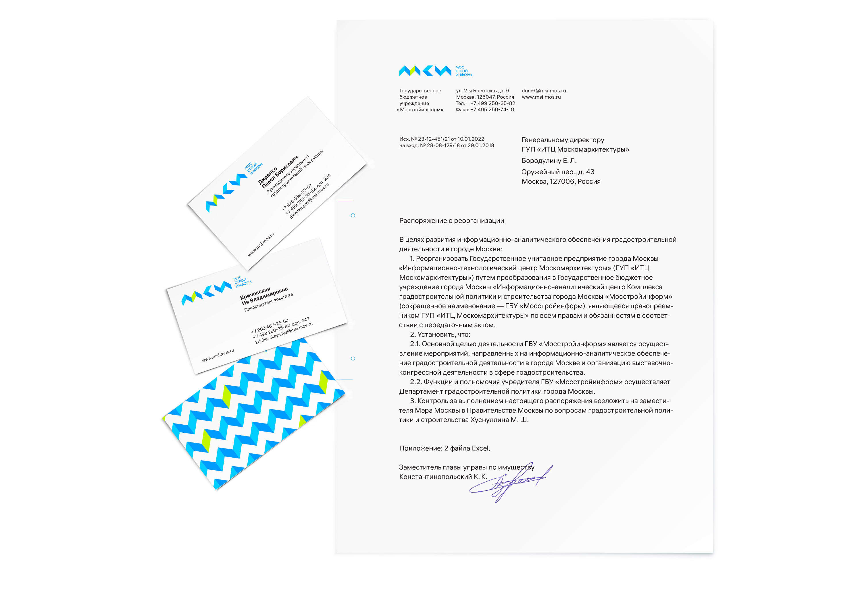 Mosstroiinform is the information and analysis center of Moscow’s construction complex. It gathers information about the work of many specialist government structures, from the Department of Urban Planning Policy to the Construction Supervision Committee. The institution also actively develops digital technologies, holds exhibitions and public lectures. To give all these diverse activities visual integrity, an identity was created in the studio.