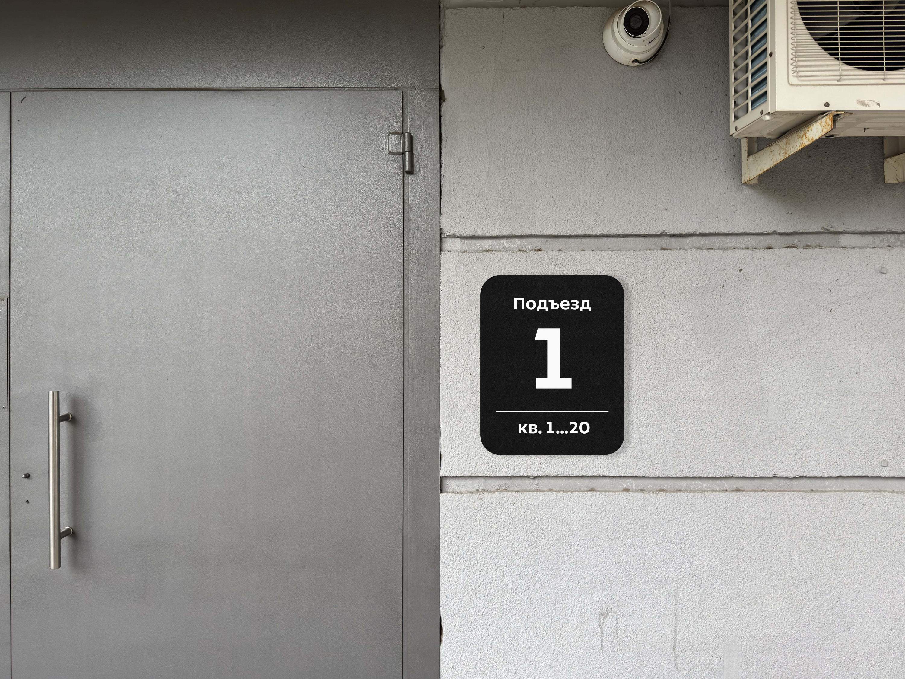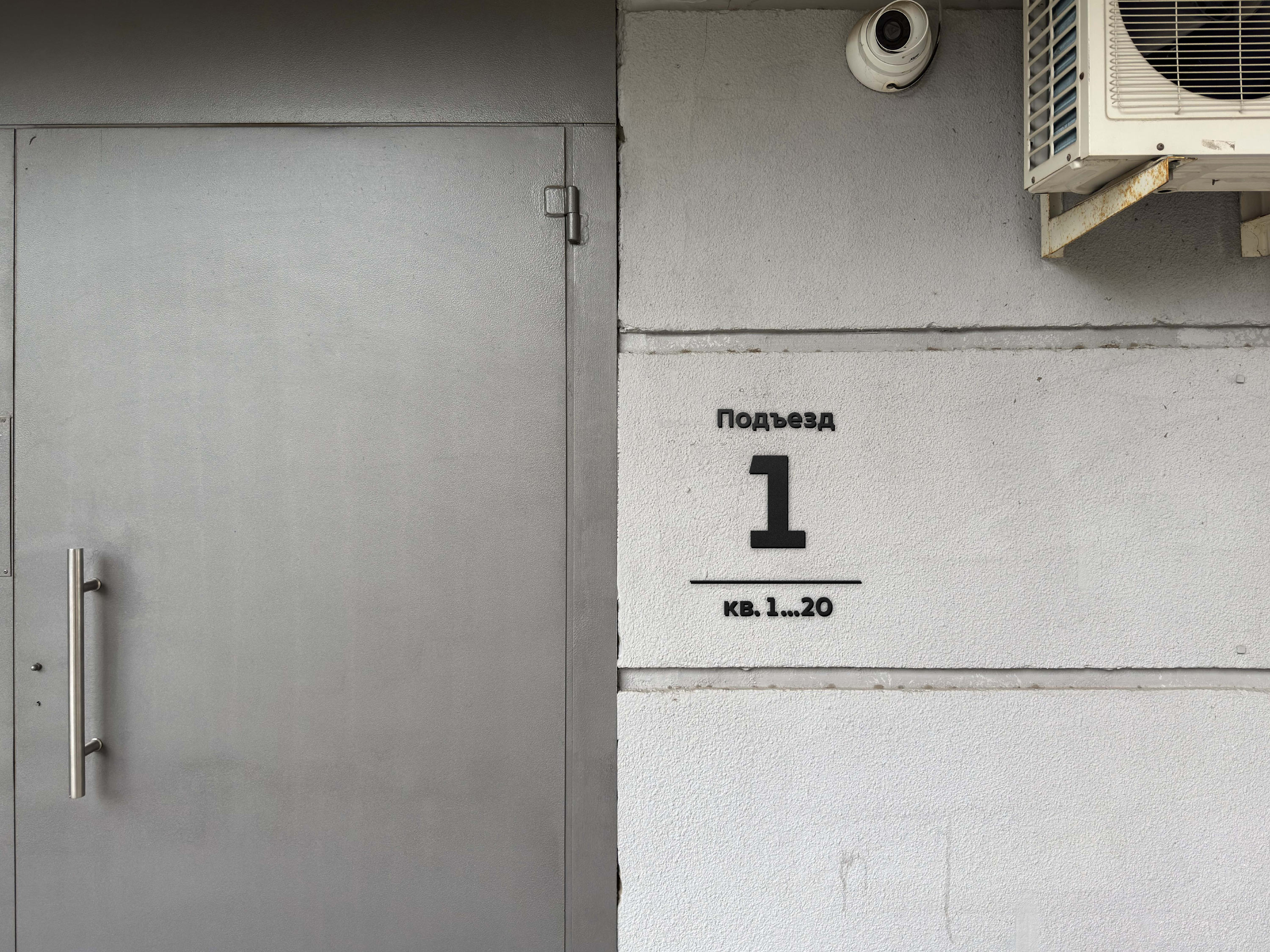 Entrance doors of apartment buildings are marked with wayfinding plates, with similar signage used for building levels.