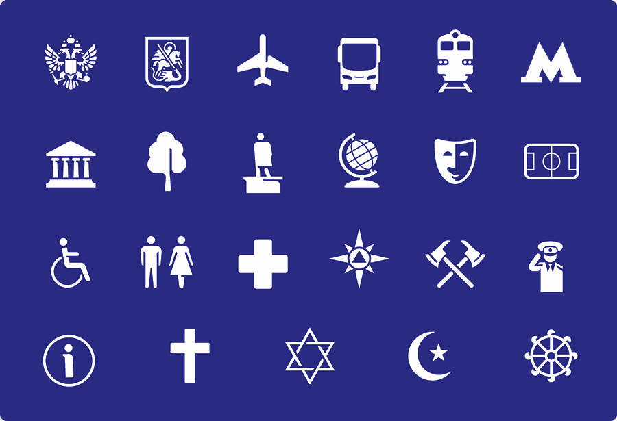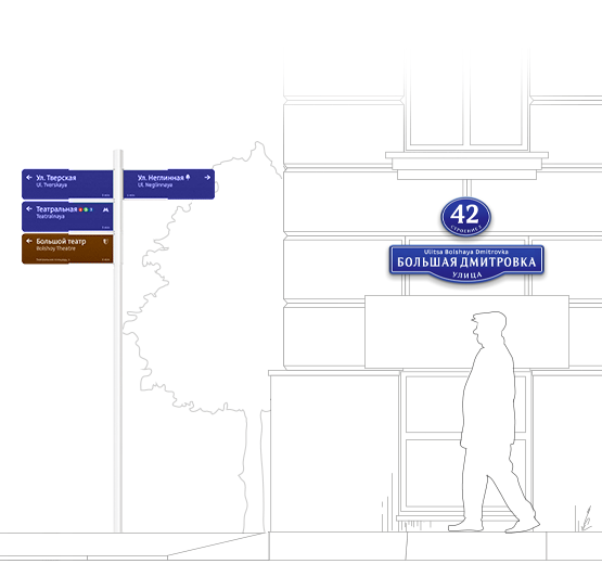Street signs indicate the location of important city objects, organizations and landmarks. They are made in the form of either free-standing structures or panel brackets for mounting on lighting and utility poles. The signs contain the name of the object in two languages, its pictogram, address and walking time in minutes. To simplify typesetting and make comprehension of long official names of state organizations easier, universal rules for their abbreviation were created. All texts on the signs are typed with the Direct-Mos typeface—a modified version of the Direct typeface created specifically for navigation.