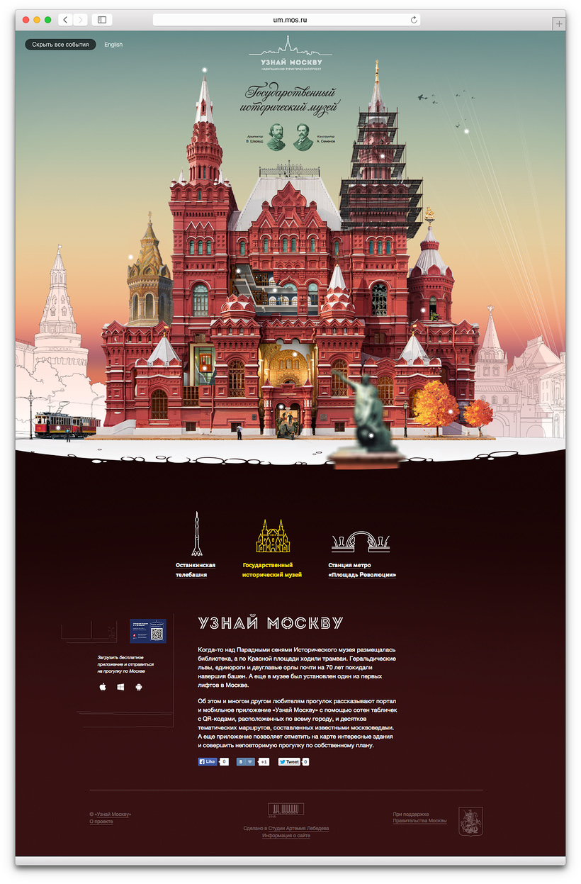 The Discover Moscow portal and mobile app provide Moscow locals and tourists with lots of interesting facts about the capital’s buildings using a large information catalog and dozens of themed routes compiled by renowned experts. A promo website that introduces users to the results of a large study of history of three famous architectural projects in Moscow was created at the studio.