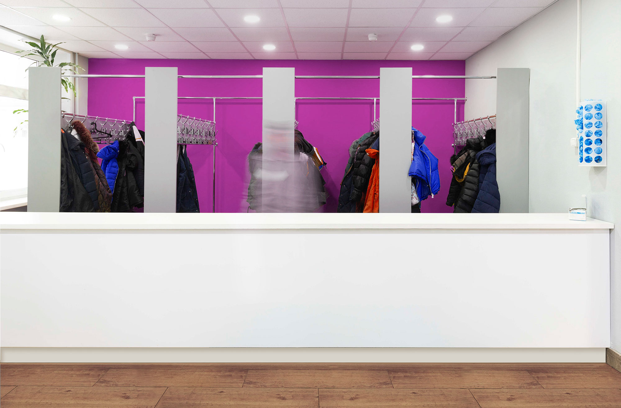 The coat room has no bars, walls or other obstacles. The back wall is painted in bright blueberry color and the attendant accepts and gives out coats behind a white counter. The open space is all in view, quiet and bright.