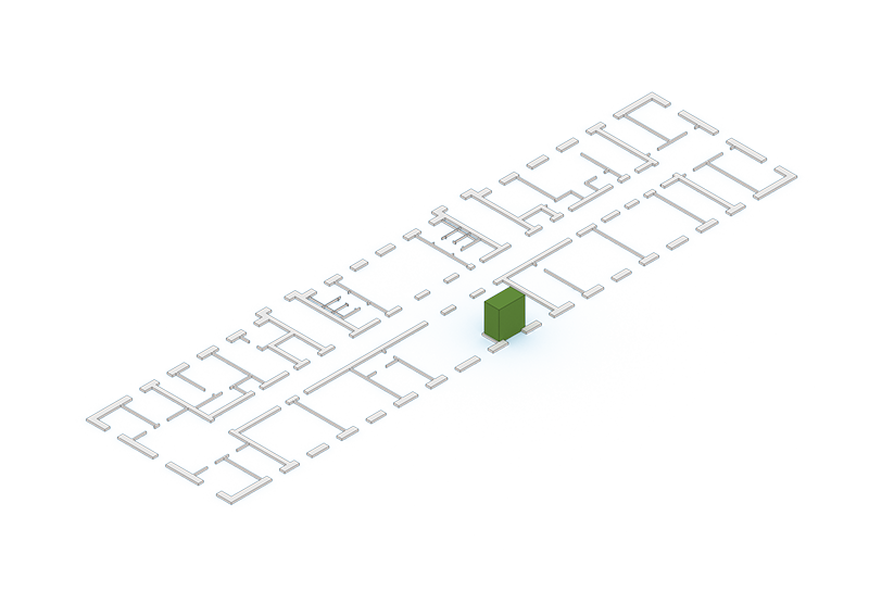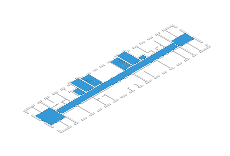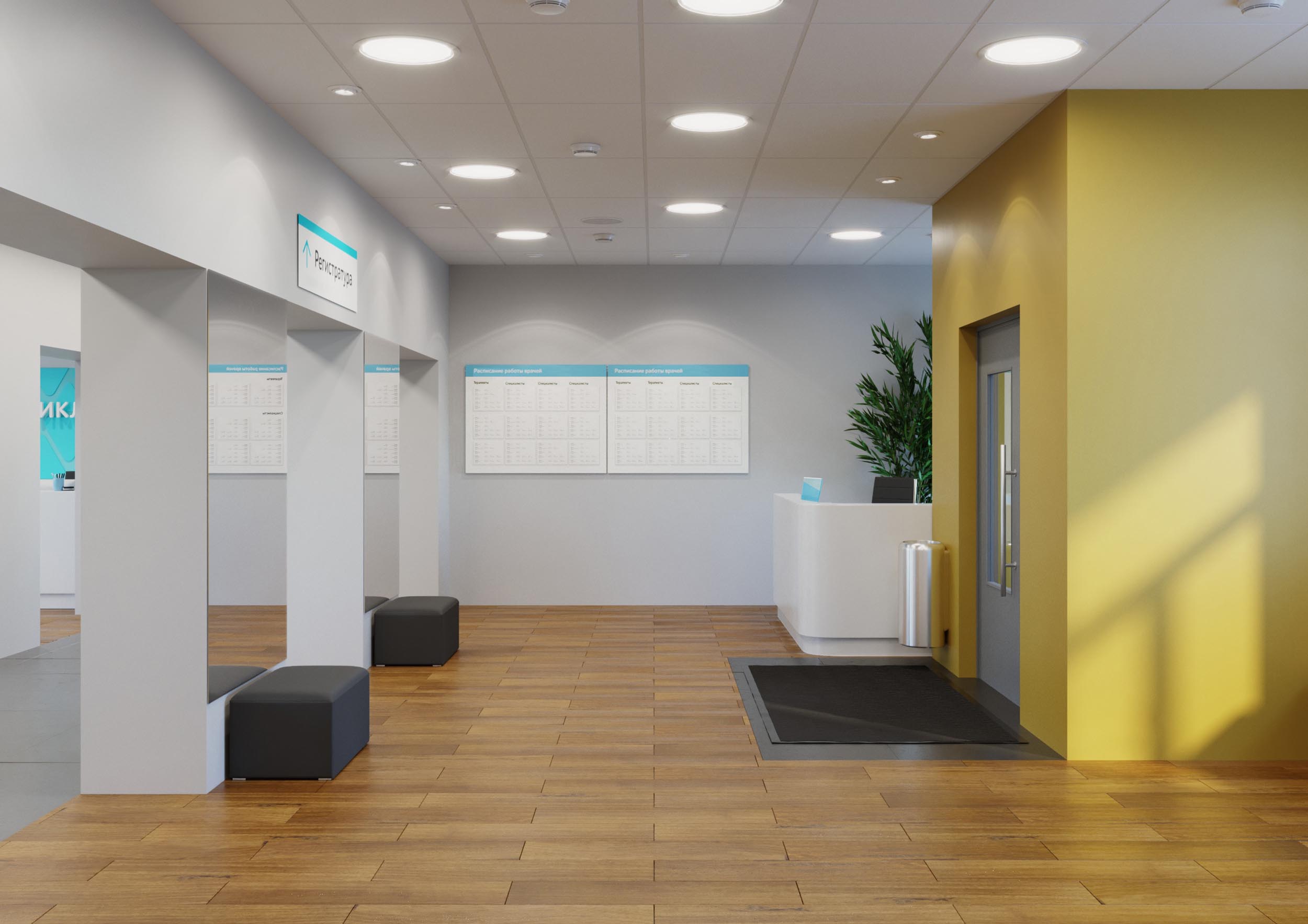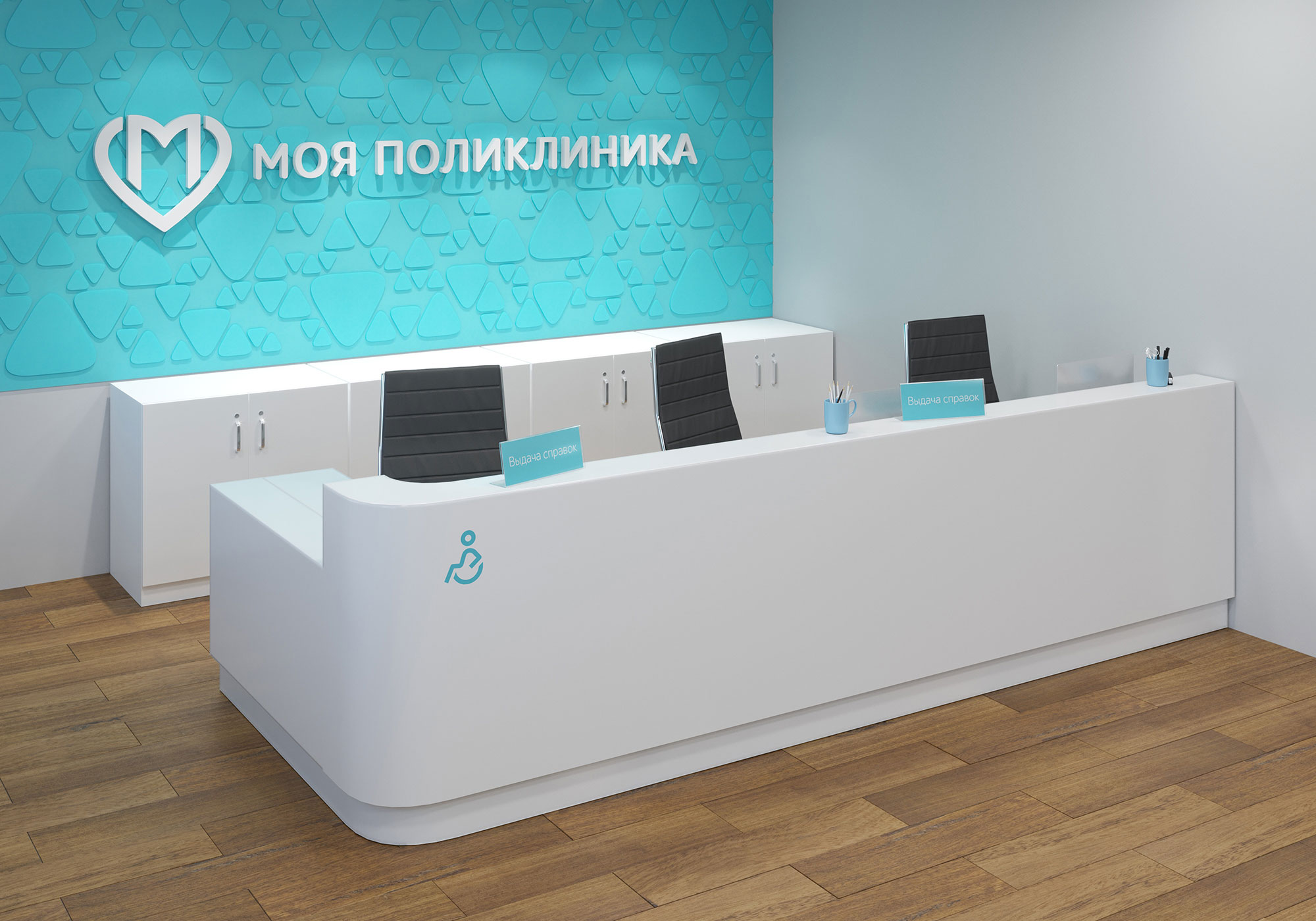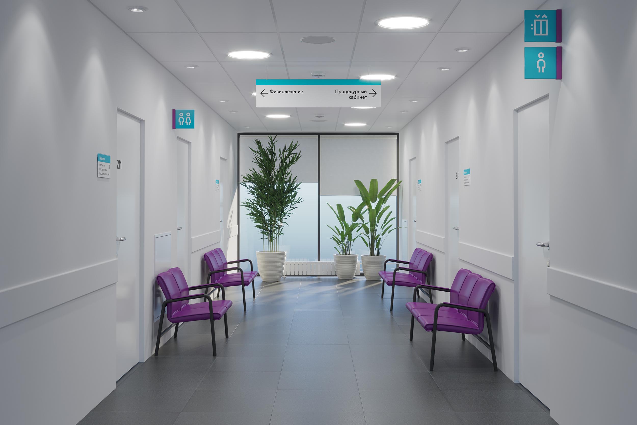 This is what things look like in adult polyclinics. In children’s polyclinics everything is just as beautiful, but the primary interior color is salad green. The triangles on the wall can be easily replaced by 3D rhombuses when a simple ready-made solution is required. Both design options are available in two colors.