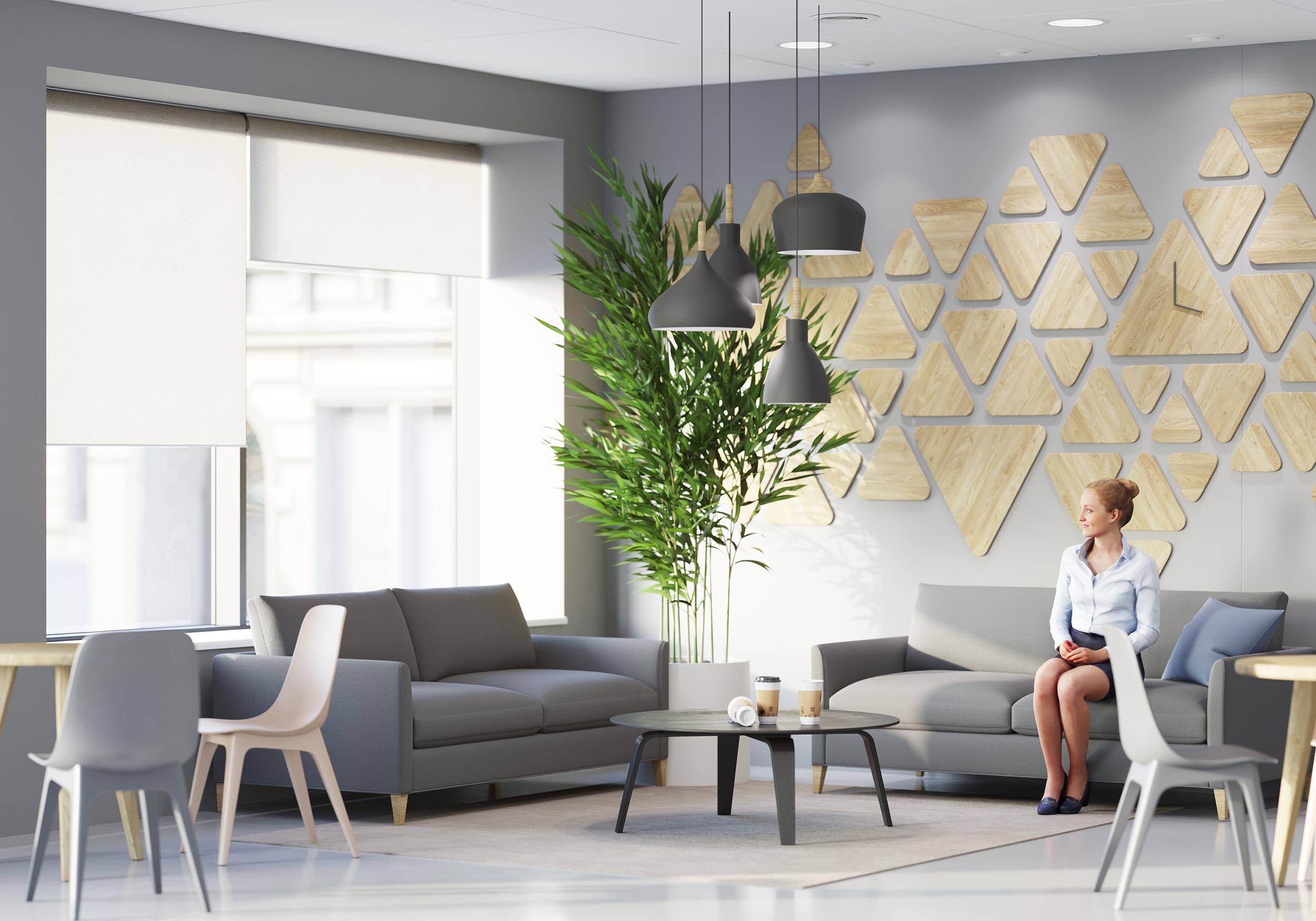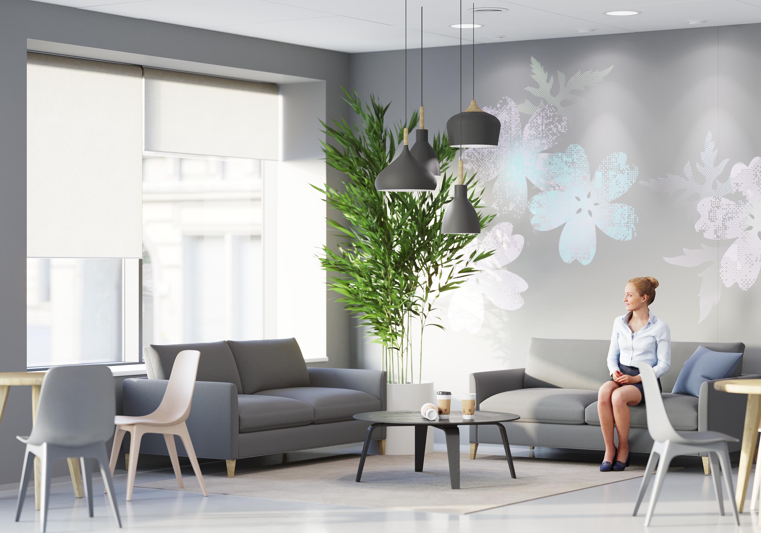 Visitors arriving early to an appointment go straight to the waiting area with sofas and flowers. The wall of the area is decorated with a soft pattern made from natural wooden panels or a gentle illustration. The ceiling has light-diffusing fixtures. And the atmosphere is quiet and peaceful.
