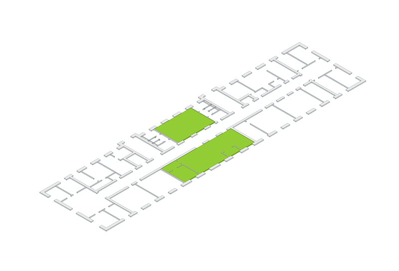 The most gloomy areas, stairways and corridors, were the ones that got transformed the most. The walls at the entrance to each floor are painted in bright colors and floor signs are placed next to doors.