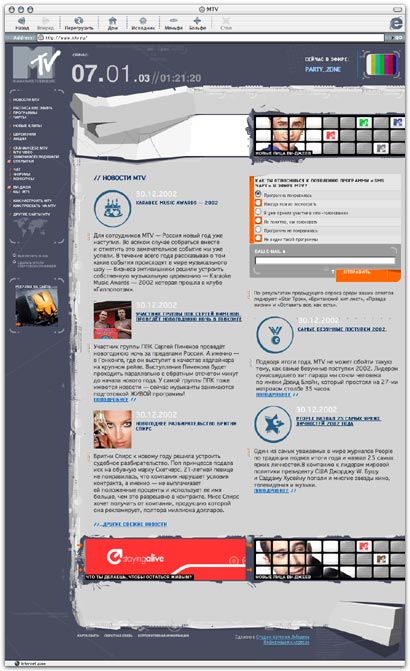 It tells you whatever you want to&nbps;know about MTV: the channels coming to Russia, music news, showbiz event announcements, broadcast schedule, tuning instructions for different cities, etc. Each MTV show has its own specially designed page, and so do all the VJs. The first version of the MTV website was created in the end of March 2002. During the last two month it was visited more than 1 500 000 times. |