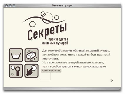 You can choose a product in the catalog or use an electronic helper that will give you a clue on which of the products meets your requirements. ![]() Secrets of Soap Bubbles Production, a flash reel in the Miscellanea section