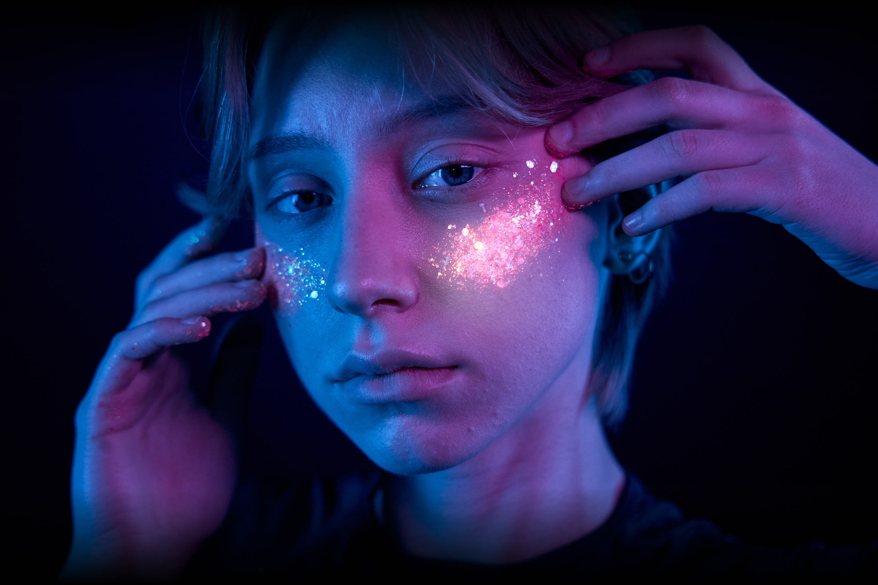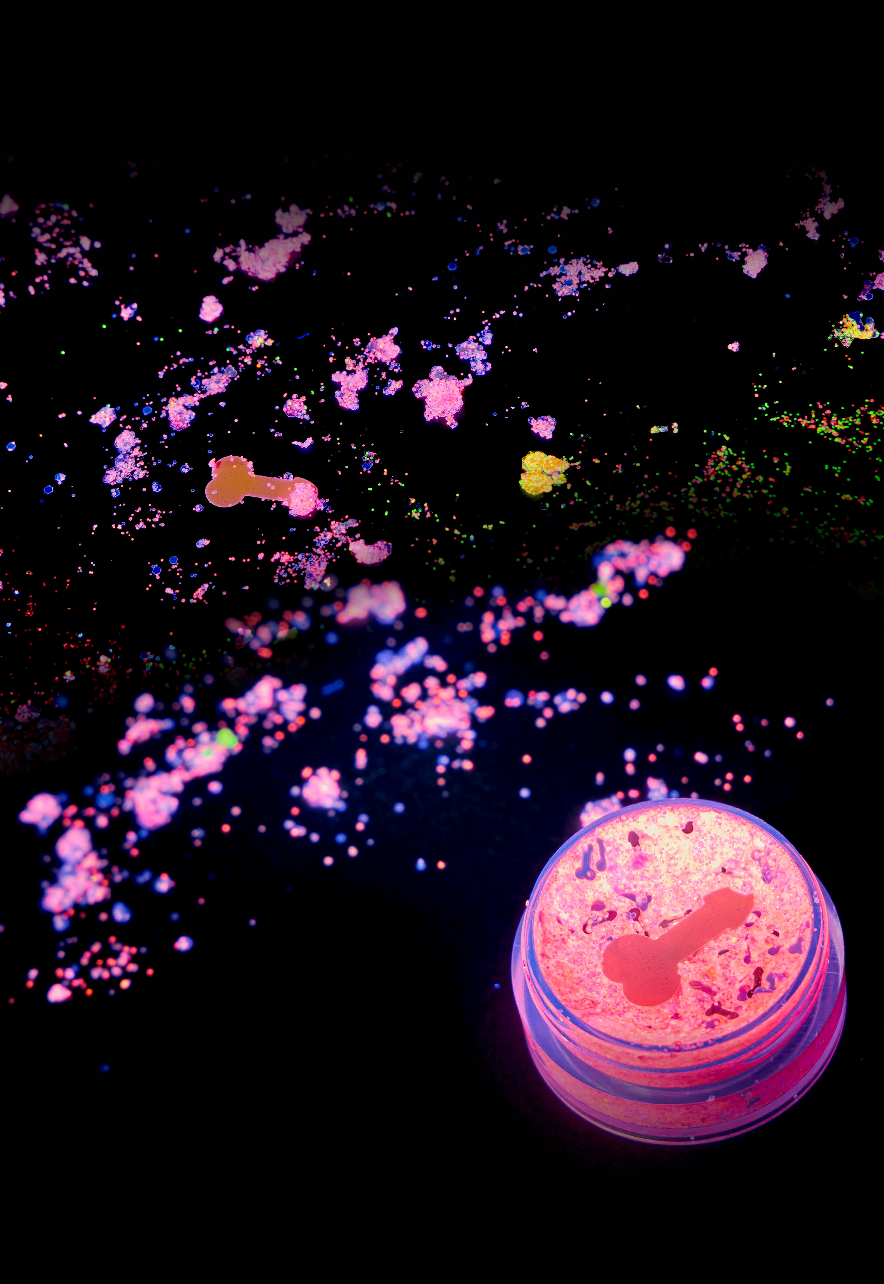 Each jar of neon Blestkus contains three types of elements: classic loose glitter, tiny little dicks scattered chaotically throughout, and one large central piece with a mirror-like shine.