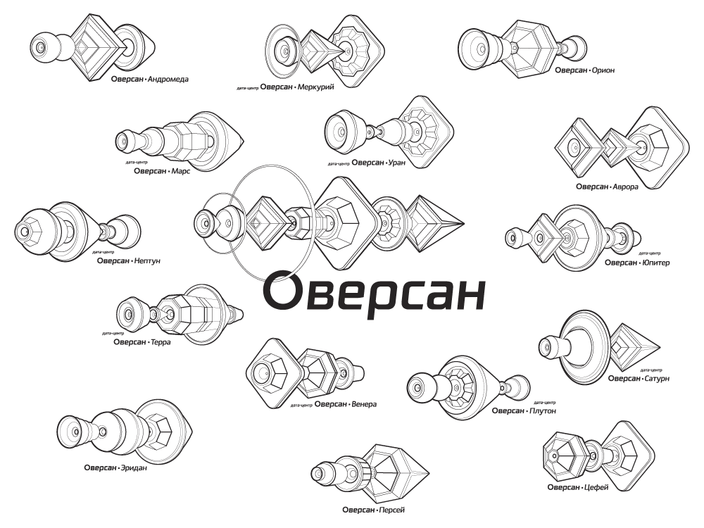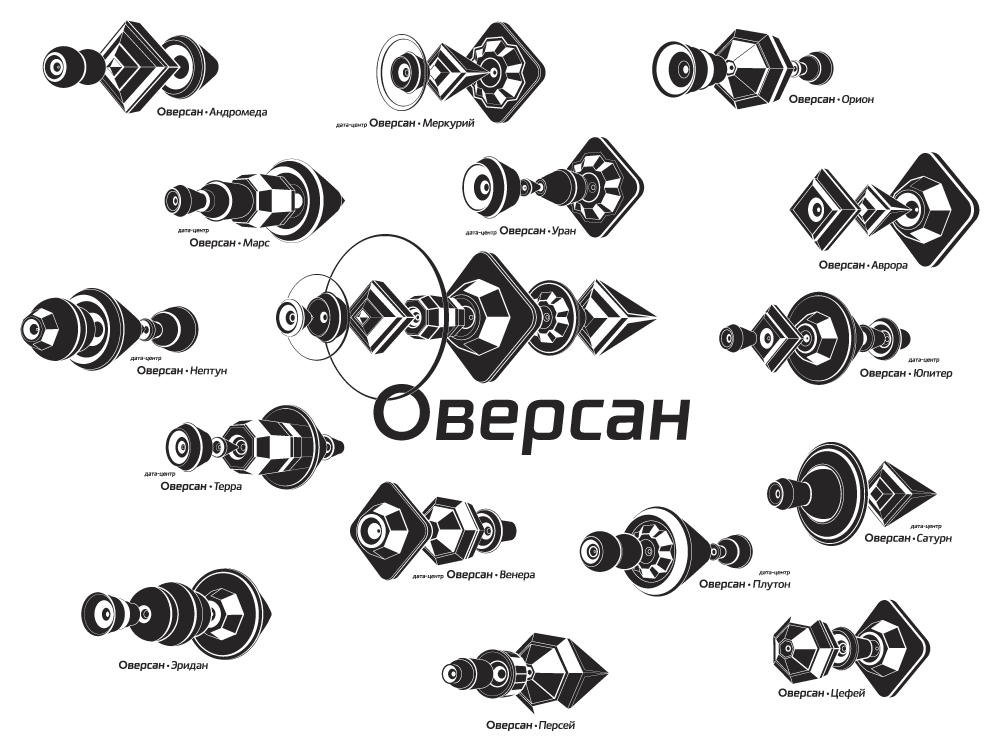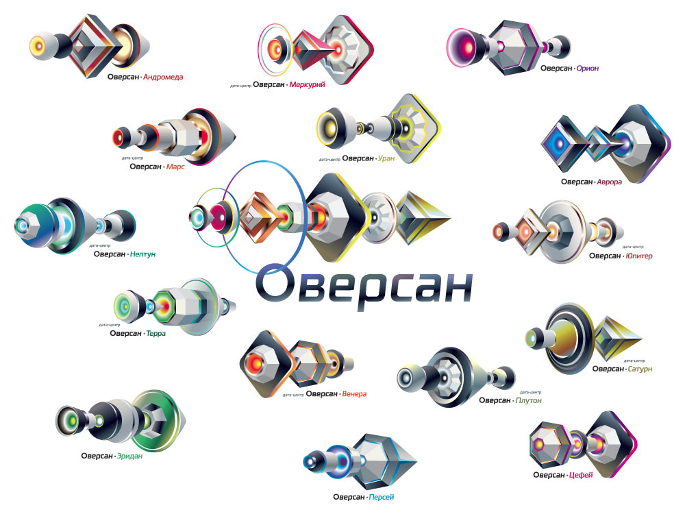 The main logo is the Oversun flagship travelling through a space portal. The whole fleet comprises logos of the data centers named after the planets of the Solar System, and other projects with names from faraway galaxies.