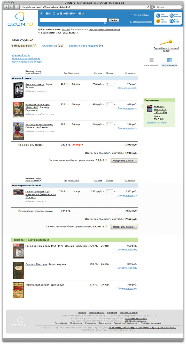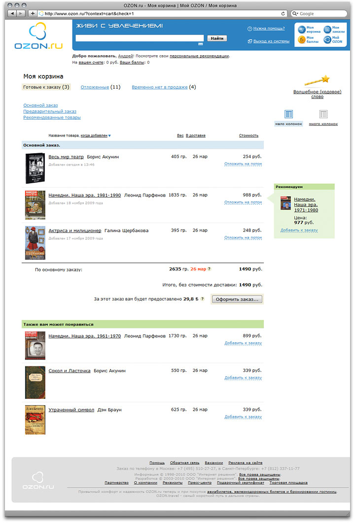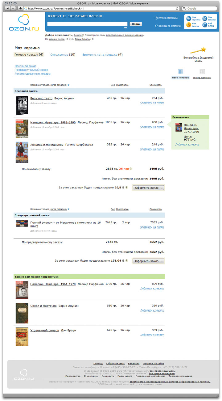 Ozon.Ru started in 1998 as a forum where sci-fi lovers could discuss books. Today it’s an online store offering more than 500 thousand items, including books, discs, movies, games, software, hardware, photography equipment, and mobile phones. Ozon customers now use the new shopping cart with user-friendly and visually appealing interface. ![]() The new way to place orders