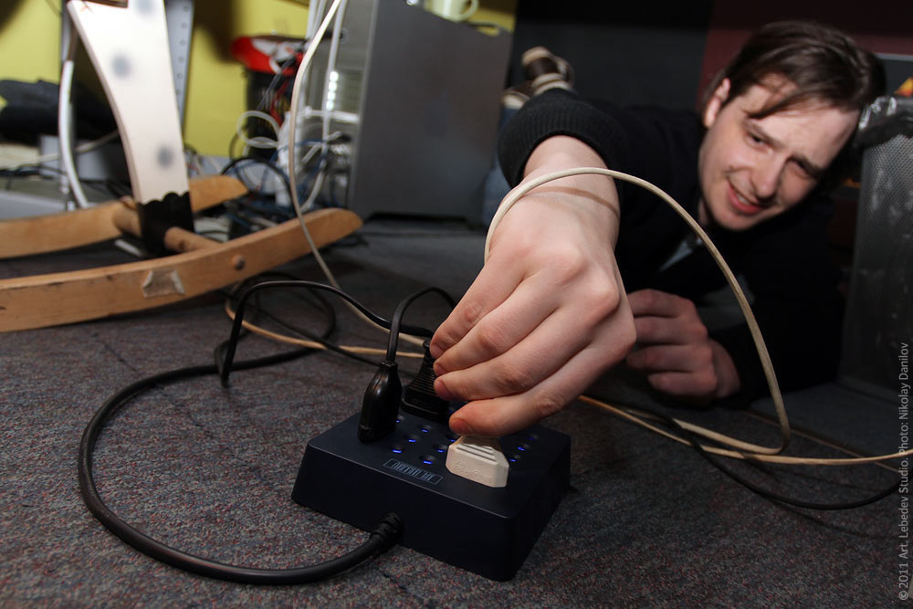 ![]() Yegor Zhgun, the creator of Rozetkus, tests one of the power strips for twelve 7/16 CEE europlugs that got through the customs and made it to Russia.