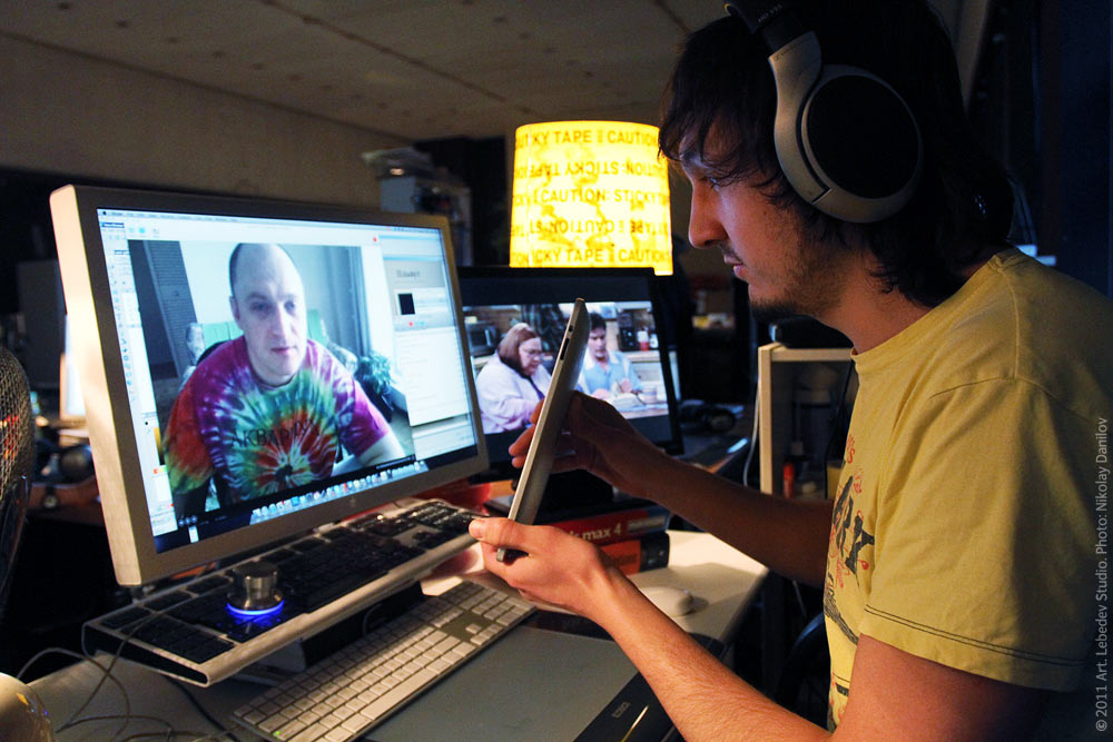 ![]() Art. Lebedev Studio designer Mikhail Miroshnikov (right) demonstrates to Toronto-based author of comic books Cat and Cat 2 Oleg Tischenkov (left) the new version of his interactive book iCat for iPad which will soon be available online.