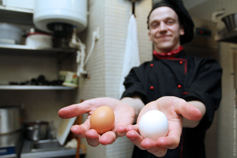 ![]() In the menus of studio’s Moscow cafés (both on Bolshaya Nikitskaya Street and on Bankovsky Lane) fried eggs are mentioned twice, with one item costing 190 rubles and the other 230. That’s because the first one is made from regular store eggs while the second one is made of irregular country ones. Pictured: chef Alexander Barmenkov at the kitchen of Art. Lebedev Studio Store and Café on Bolshaya Nikitskaya shows how an egg from Natalya Rizhova from Stepkovo village of Alexandrovsky district of Vladimirskaya region (right) differs from a regular one. Fresh country eggs are always available at Art. Lebedev Studio Store and Big Café on Bankovsky, ten eggs cost 120 rubles.