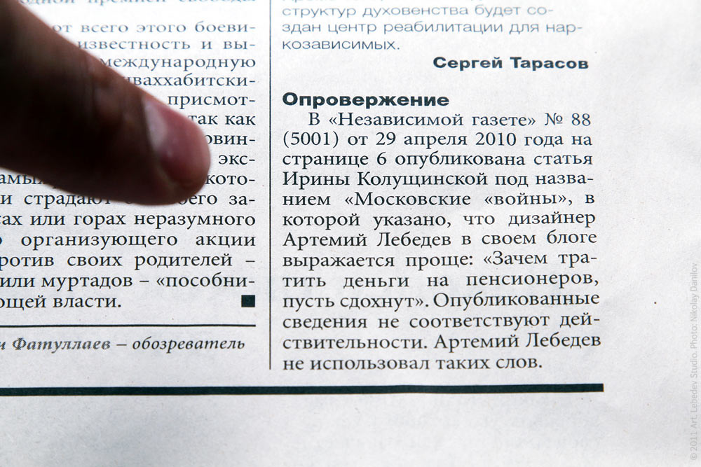 ![]() Art. Lebedev Studio lawyer Evgeny Potanin points at a retraction published in Nezavisimaya Gazeta on March 21, 2011 on page six in the column “In Brief / Main news from the Internet www.ng.ru”.