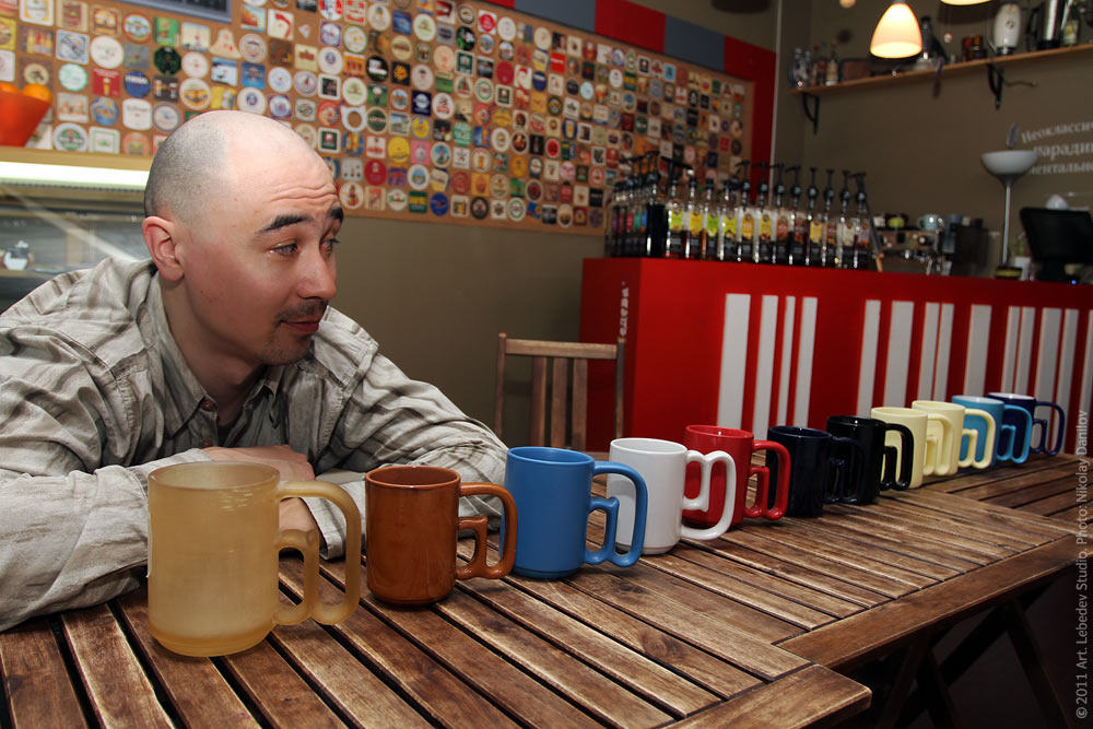 ![]() Studio’s art director Timur Burbayev demonstrates key stages of evolution of the Atmark mug from 2002 until present. Left to right: 1—preproduction sample of the Atmark mug from ColorShift series made by laser stereolithography (early 2002); 2—prototype produced by Latvijas Keramika (2002); 3—production sample of a matte mug produced in Latvia (2002); 4—one of the first prototypes produced in China (Chinese experts decided to improve the design and attached the @-shaped handle upside down); 5, 6 and 7—production samples of Atmark 1.0 mugs produced in China (2005); 8 and 9—Atmark 2.0 prototypes (with a modified handle, thin walls and a notch under the handle) created at the studio on a 3D printer; 10 and 11—Atmark 2.0 production samples with white internal surface produced in China (2007).